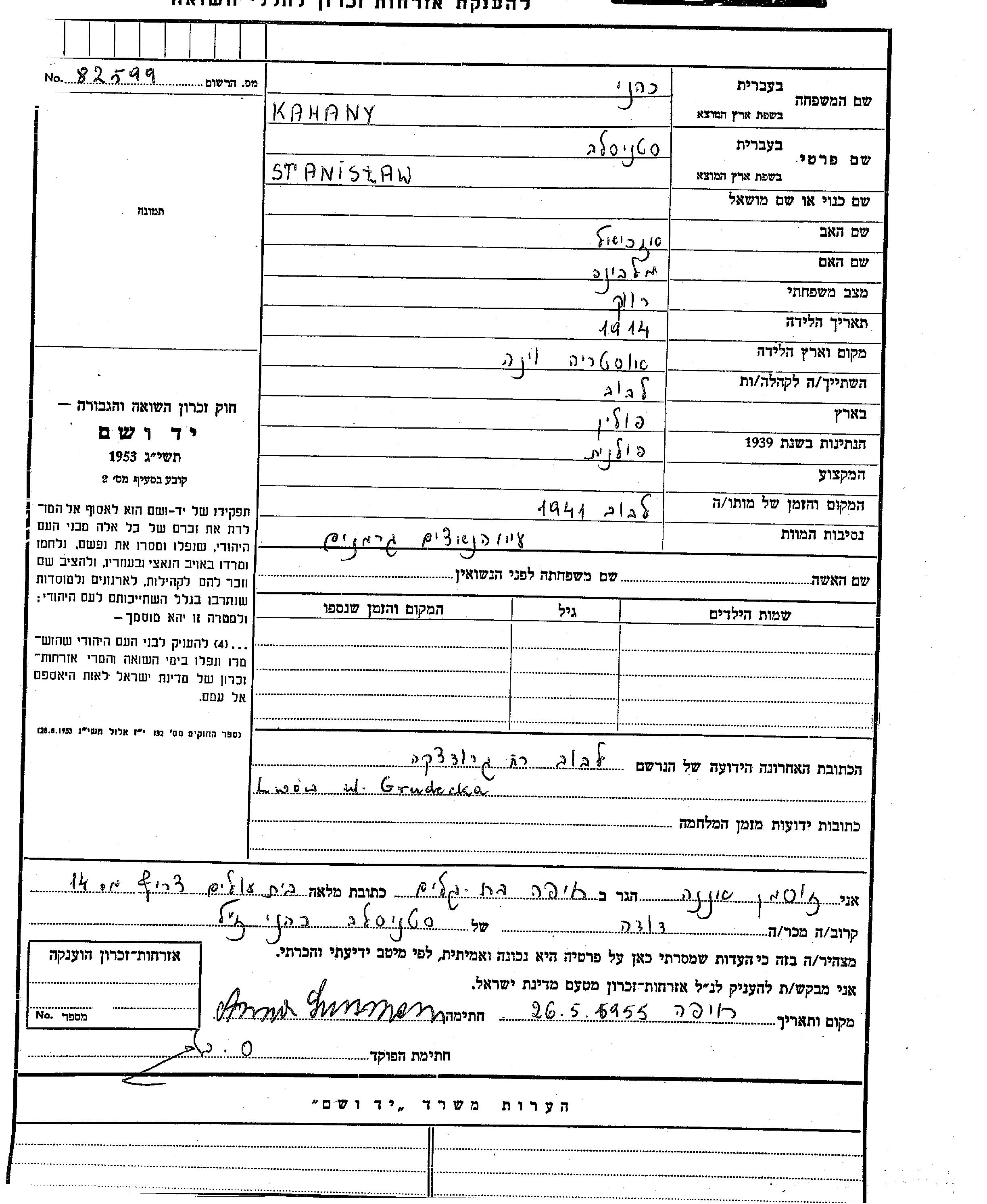 Stanislaw Kahany wurde im Jahr 1914 in Wien, Österreich geboren. Er war der Sohn von Azriel und Malvina. Er war Ledig. Vor dem Zweiten Weltkrieg lebte er in Lwow, Polen. Während des Krieges war er in Lwow, Polen.