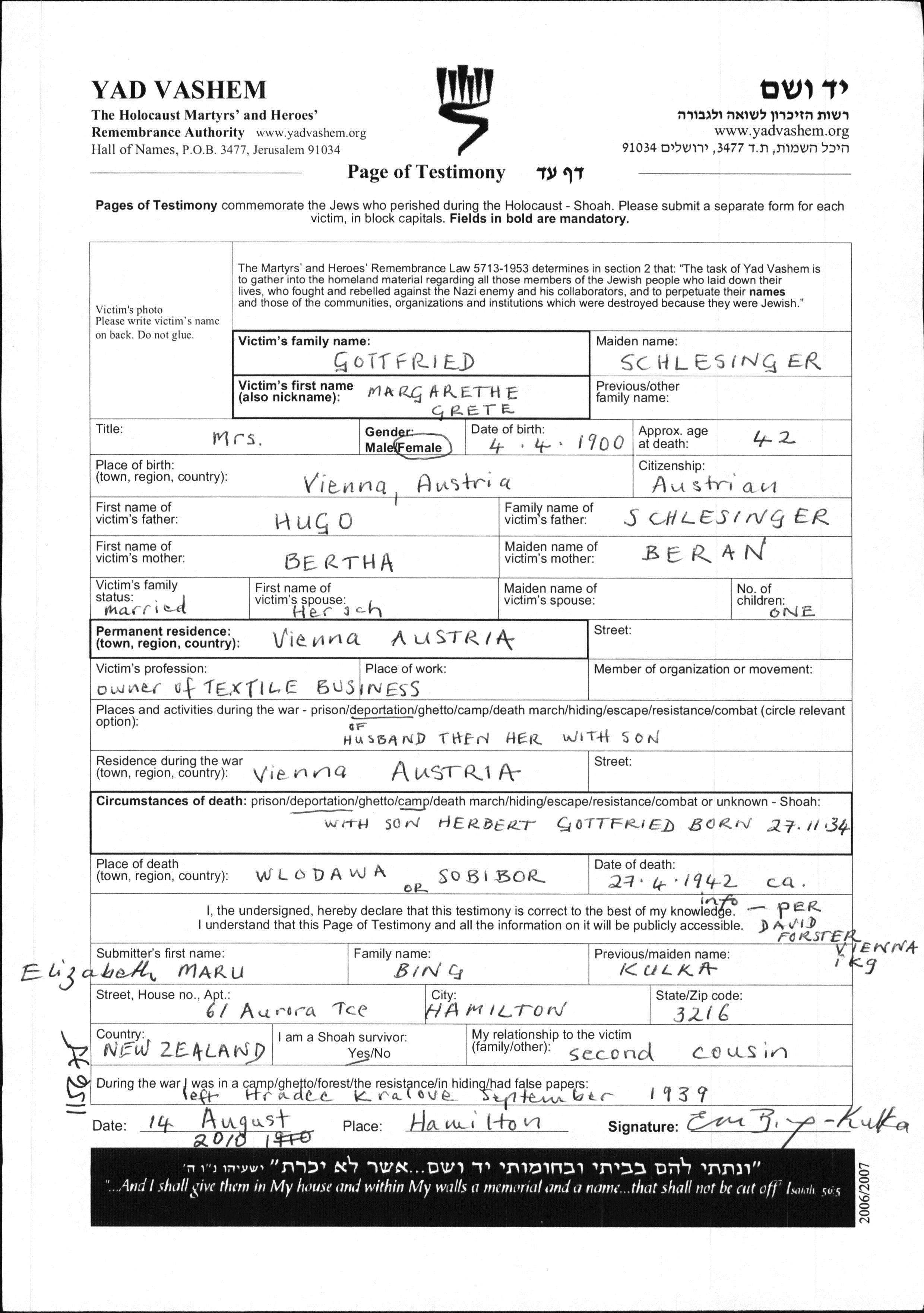 Margarethe Grete Gottfried, geb. Schlesinger wurde im Jahr 1900 in Vienna, Österreich geboren. Sie war die Tochter von Hugo und Bertha, geb. Beran. Sie war Owner of textiles shop und mit Hersch Verheiratet. Vor dem Zweiten Weltkrieg lebte sie in Vienna, Österreich. Während des Krieges war sie in Vienna, Österreich.