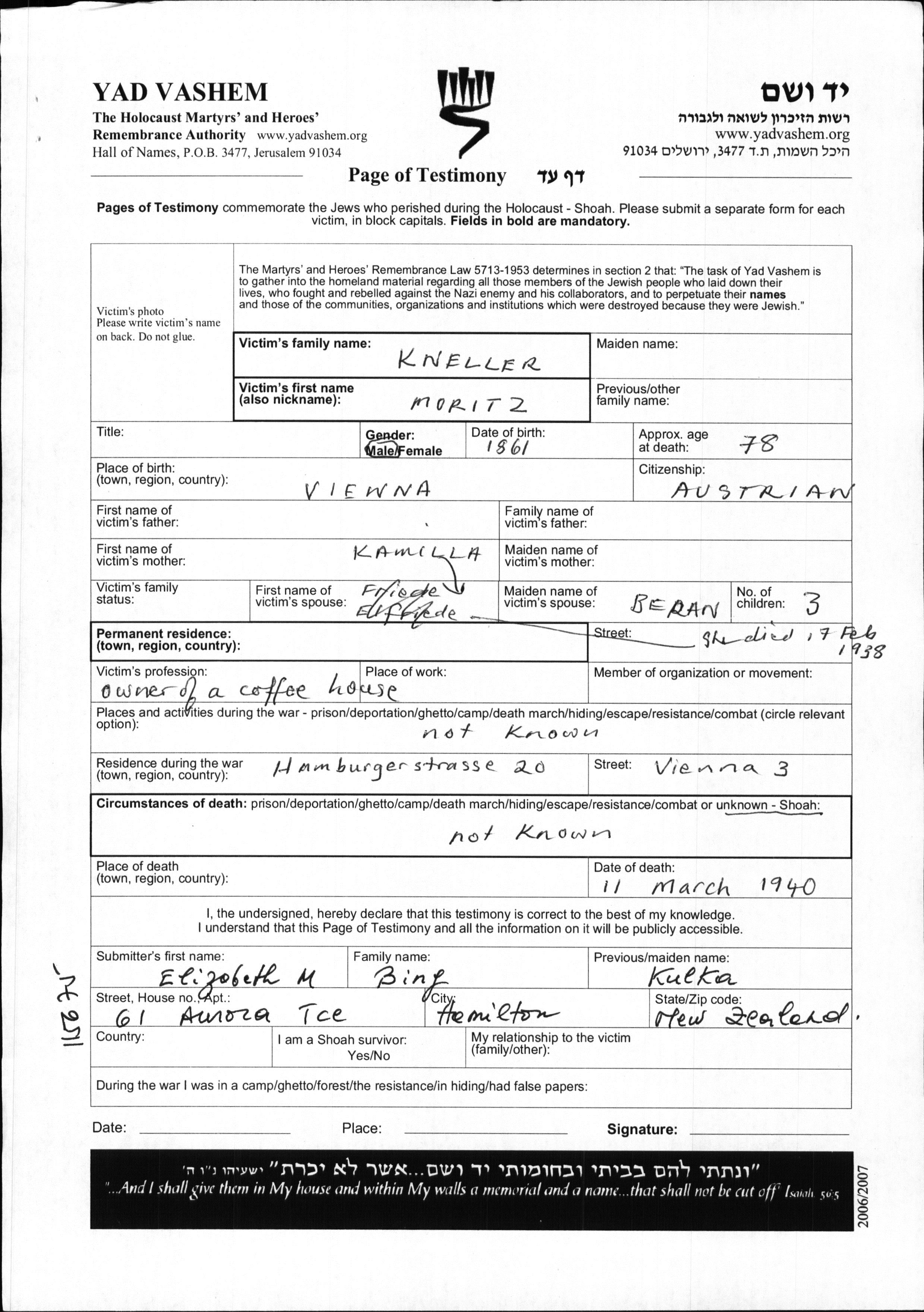Moritz Kneller wurde im Jahr 1861 in Vienna, Österreich geboren. Er war mit Kamilla, geb. Beran Verheiratet. Vor dem Zweiten Weltkrieg lebte er in Vienna, Österreich. Während des Krieges war er in Vienna, Österreich.