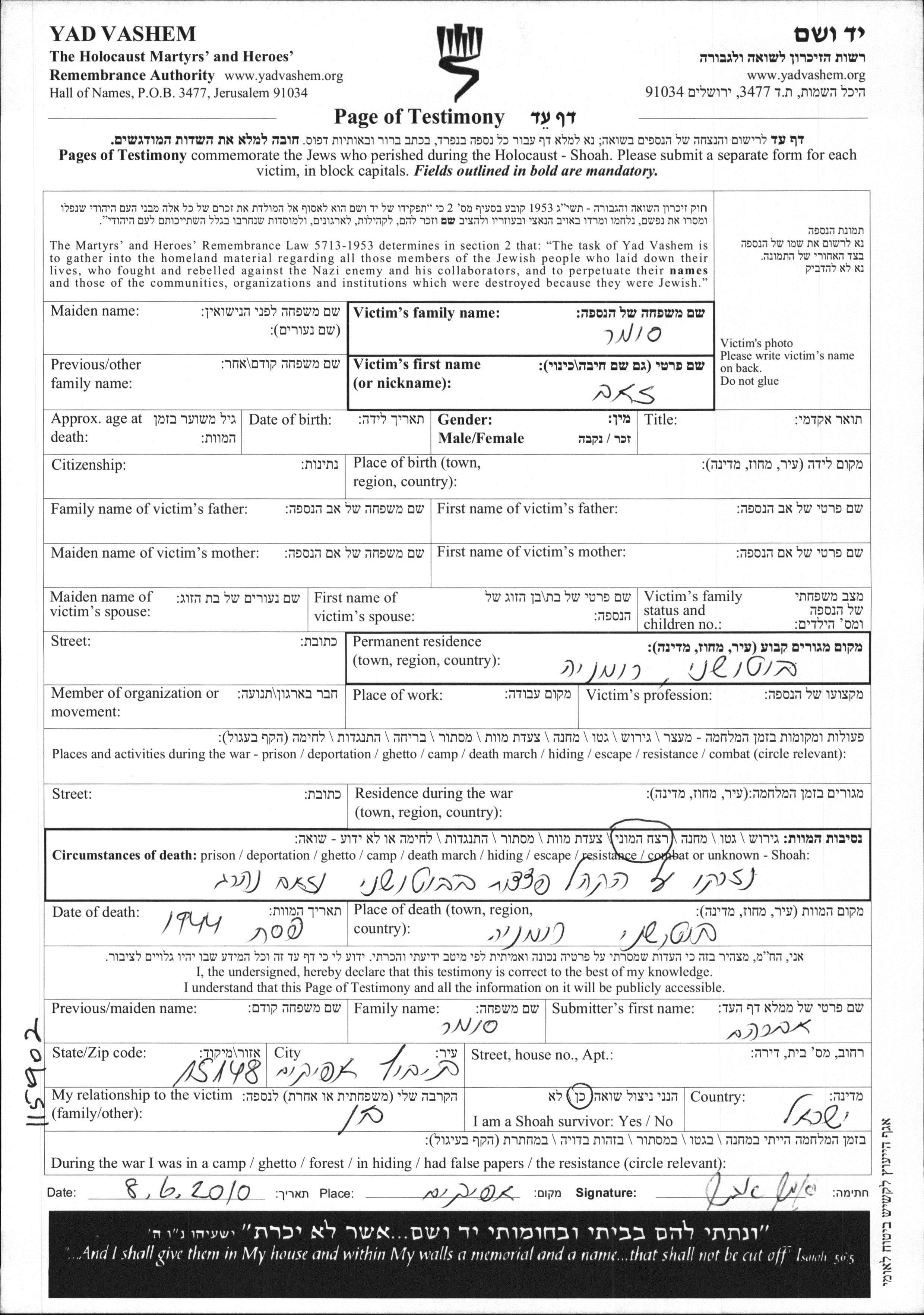 Zeev wurde in der Schoah ermordet. Todesort: Botosani, Rumänien im Jahr 1944.