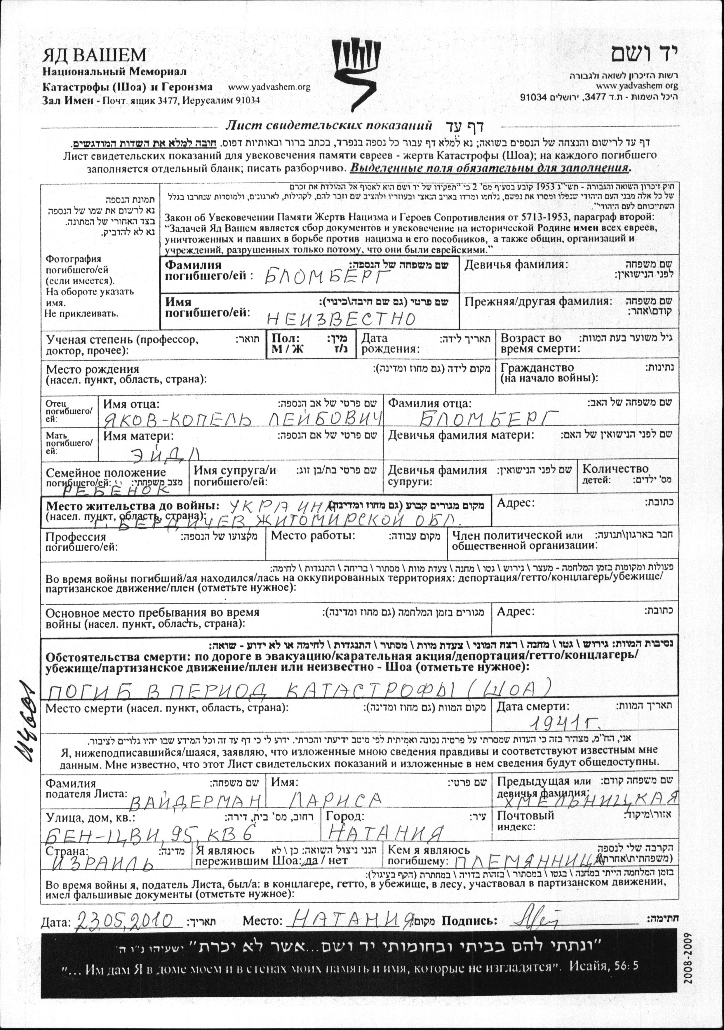 Blomberg Vorname unbekannt Berdichev, Ukraine (UdSSR) Gedenkblatt