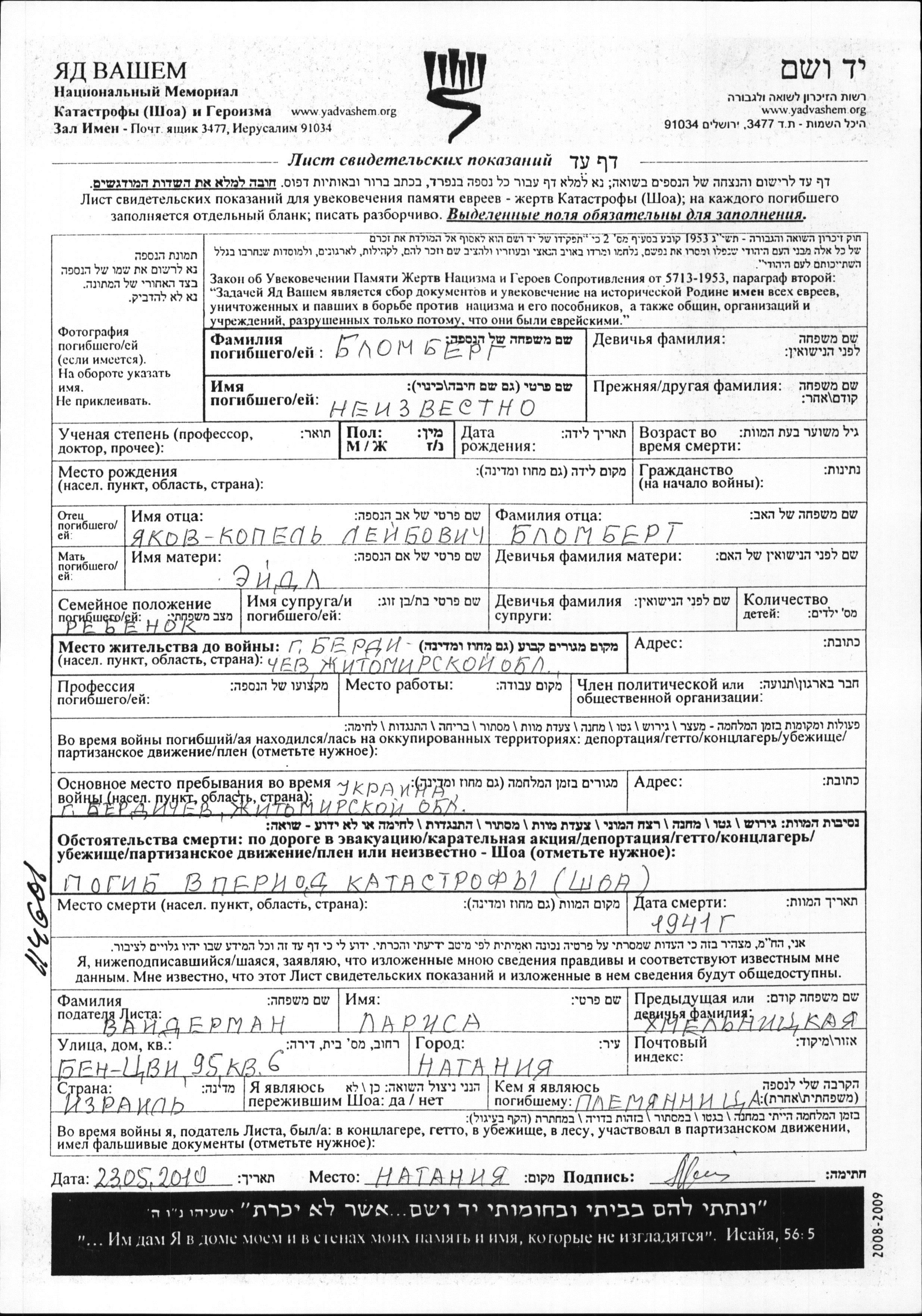 Vorname unbekannt Blomberg wurde Er war der Sohn von Yakov und Eydl. Er war Kind. Vor dem Zweiten Weltkrieg lebte er in Berdichev, Ukraine (UdSSR). Während des Krieges war er in Berdichev, Ukraine (UdSSR).