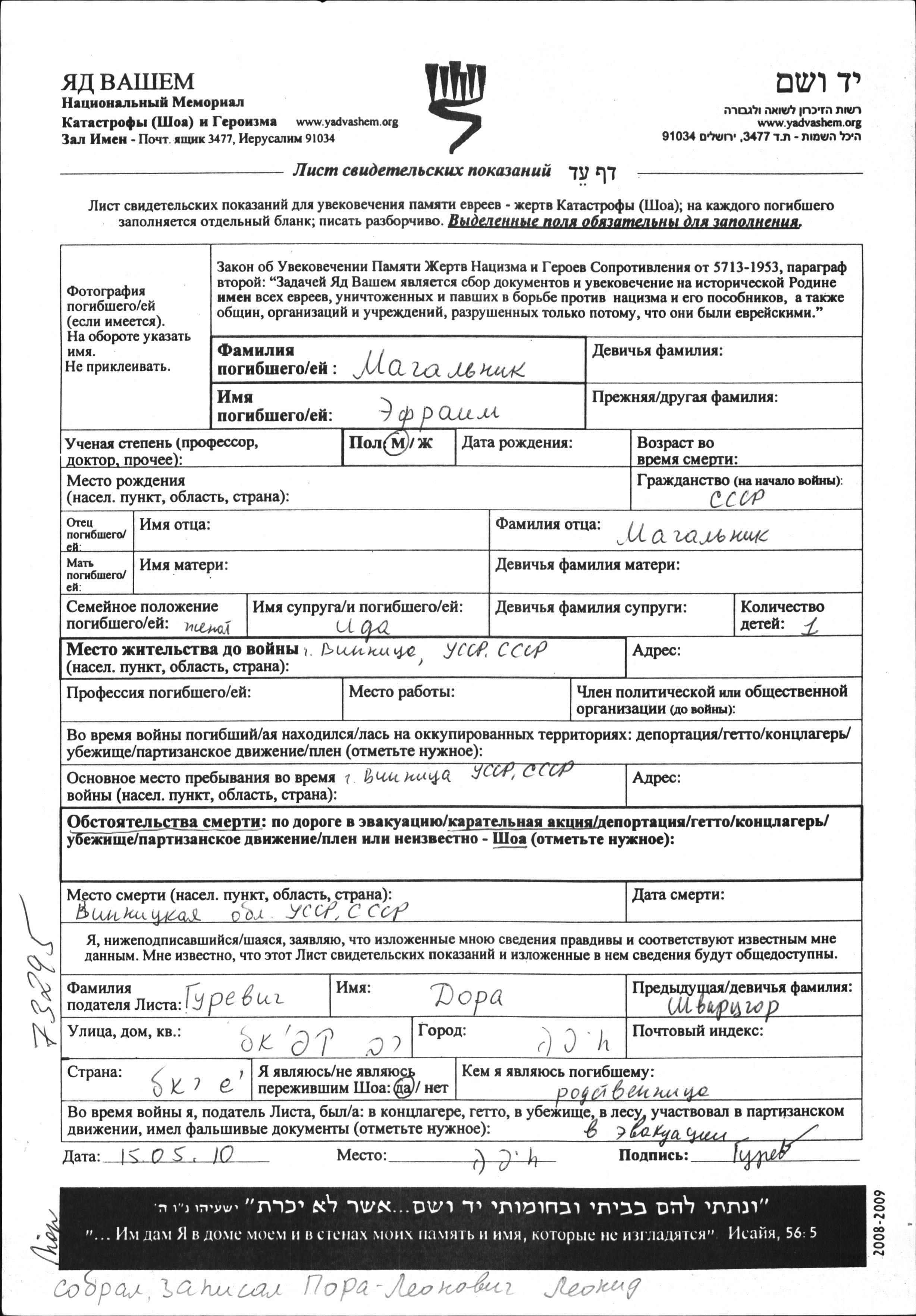 Efraim Magalnik. Er war mit Ida Verheiratet. Vor dem Zweiten Weltkrieg lebte er in Vinnitsa, Ukraine (UdSSR). Während des Krieges war er in Vinnitsa, Ukraine (UdSSR).