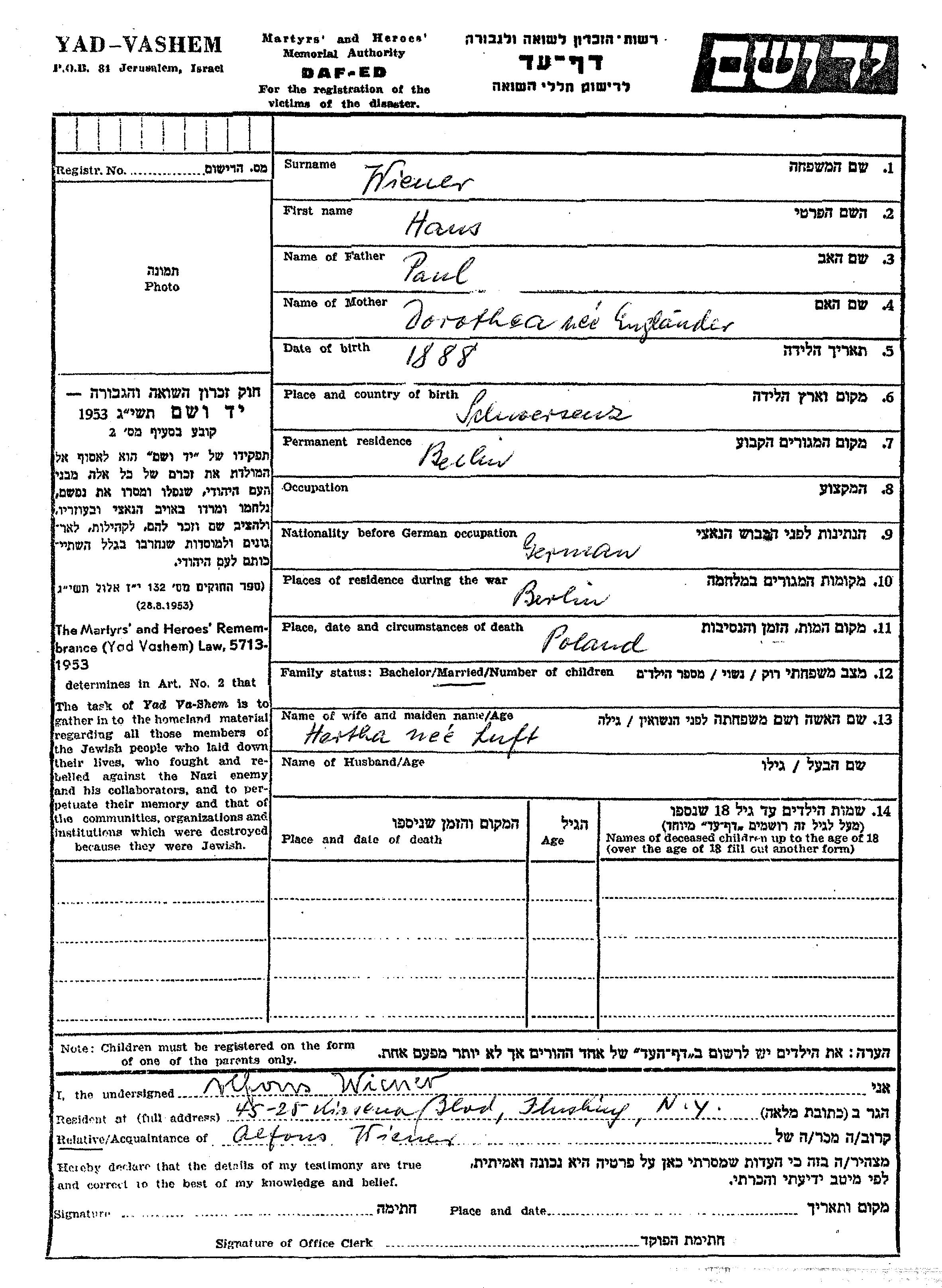 Hans Wiener wurde im Jahr 1888 in Schochwitz, Deutsches Reich geboren. Er war der Sohn von Paul und Dorothea. Er war mit Hertha, geb. Luft Verheiratet. Vor dem Zweiten Weltkrieg lebte er in Berlin, Deutsches Reich. Während des Krieges war er in Berlin, Deutsches Reich.