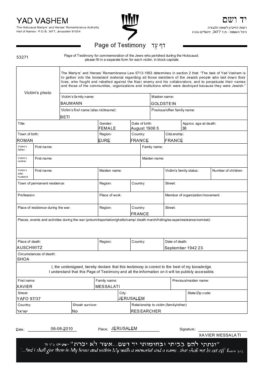 Beti Baumann, geb. Goldstein wurde im Jahr 1906 in Roman, Rumänien geboren. Sie war Verheiratet. Vor dem Zweiten Weltkrieg lebte sie in Frankreich. Während des Krieges war sie in Frankreich. Beti wurde in der Schoah ermordet. Todesort: Auschwitz, Polen im Jahr 23/09/1942.
