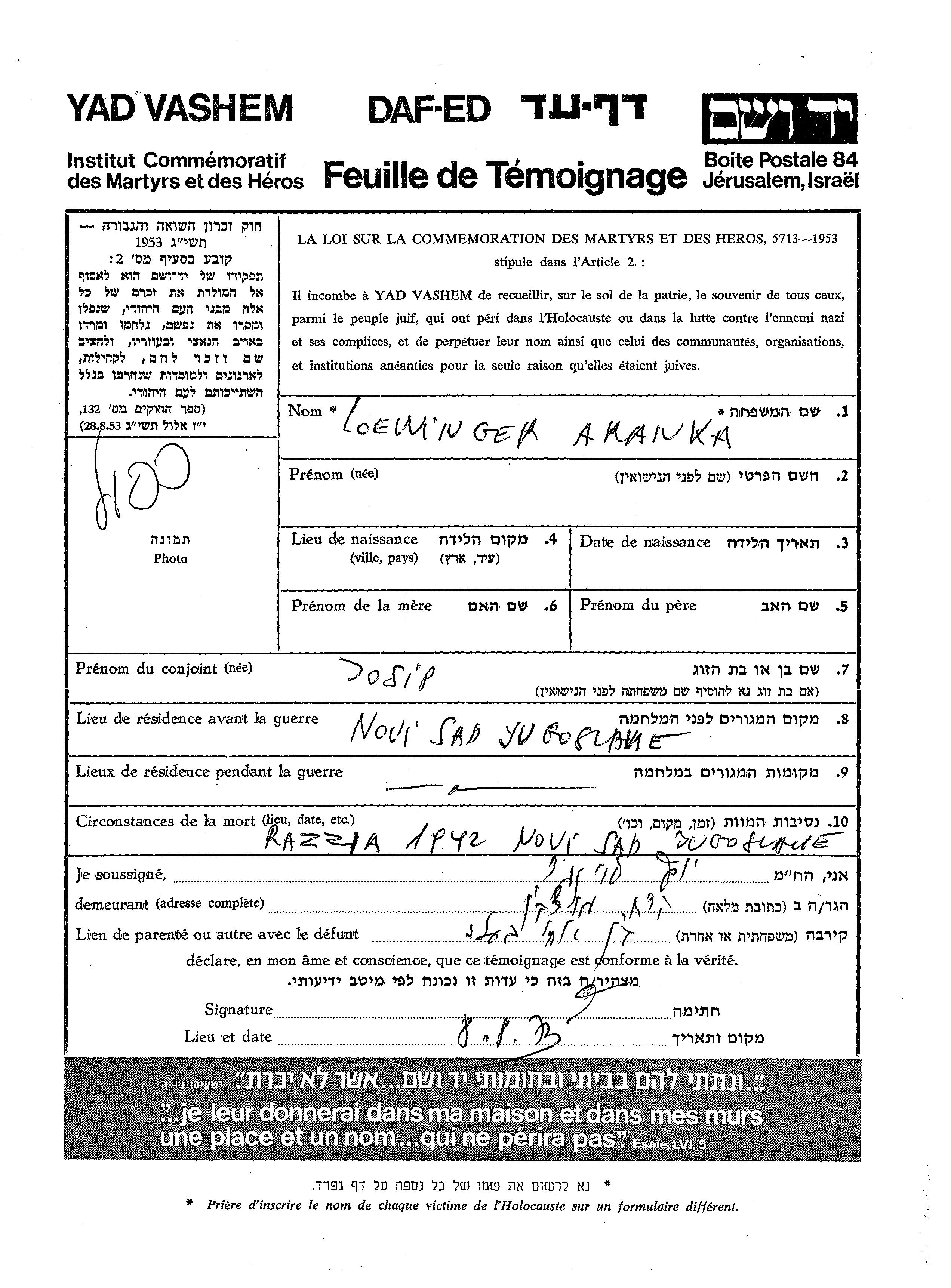 Aranka wurde in der Schoah ermordet. Todesort: Novi Sad, Jugoslawien im Jahr 1942.