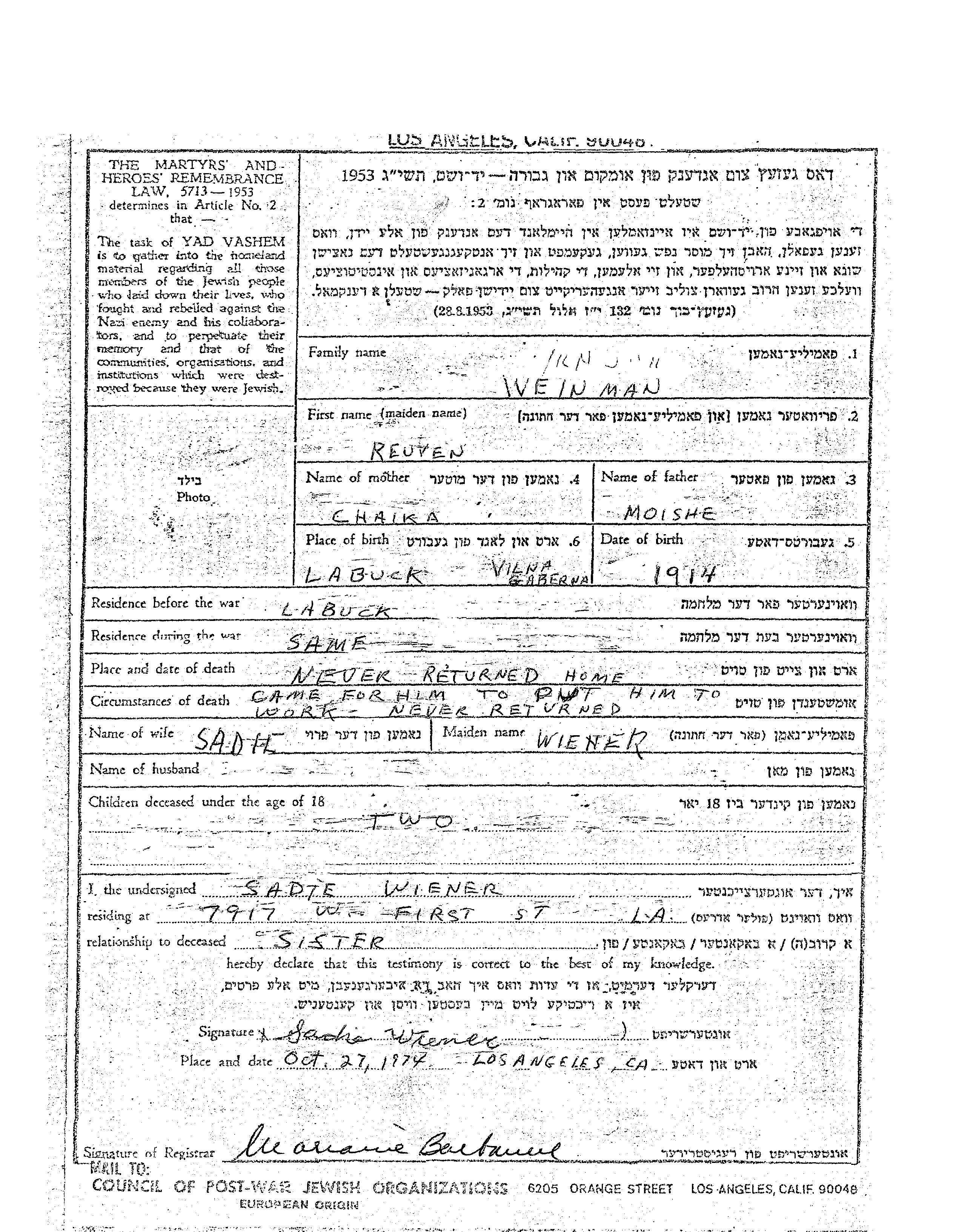 Reuven Weinman wurde im Jahr 1914 in Vilna, Polen geboren. Er war der Sohn von Moishe und Chaika. Er war mit Sadie, geb. Wener Verheiratet. Vor dem Zweiten Weltkrieg lebte er in Labuck, Polen. Während des Krieges war er in Labuck, Polen.
