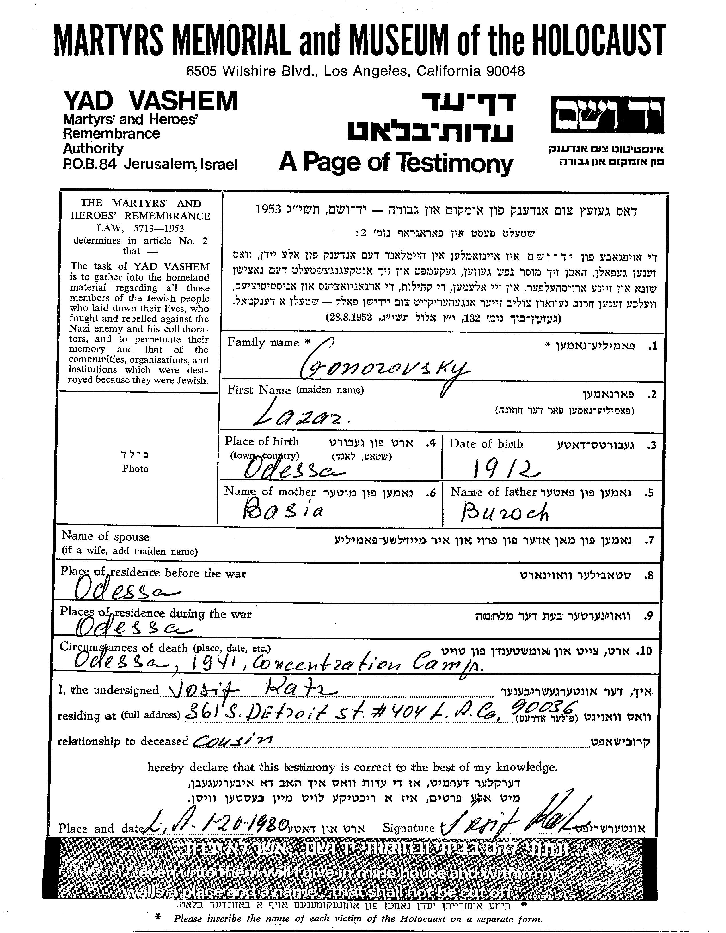Lazar Gonorovsky wurde im Jahr 1912 in Odessa, Ukraine (UdSSR) geboren. Er war der Sohn von Buroch und Basia. Vor dem Zweiten Weltkrieg lebte er in Odessa, Ukraine (UdSSR). Während des Krieges war er in Odessa, Ukraine (UdSSR).