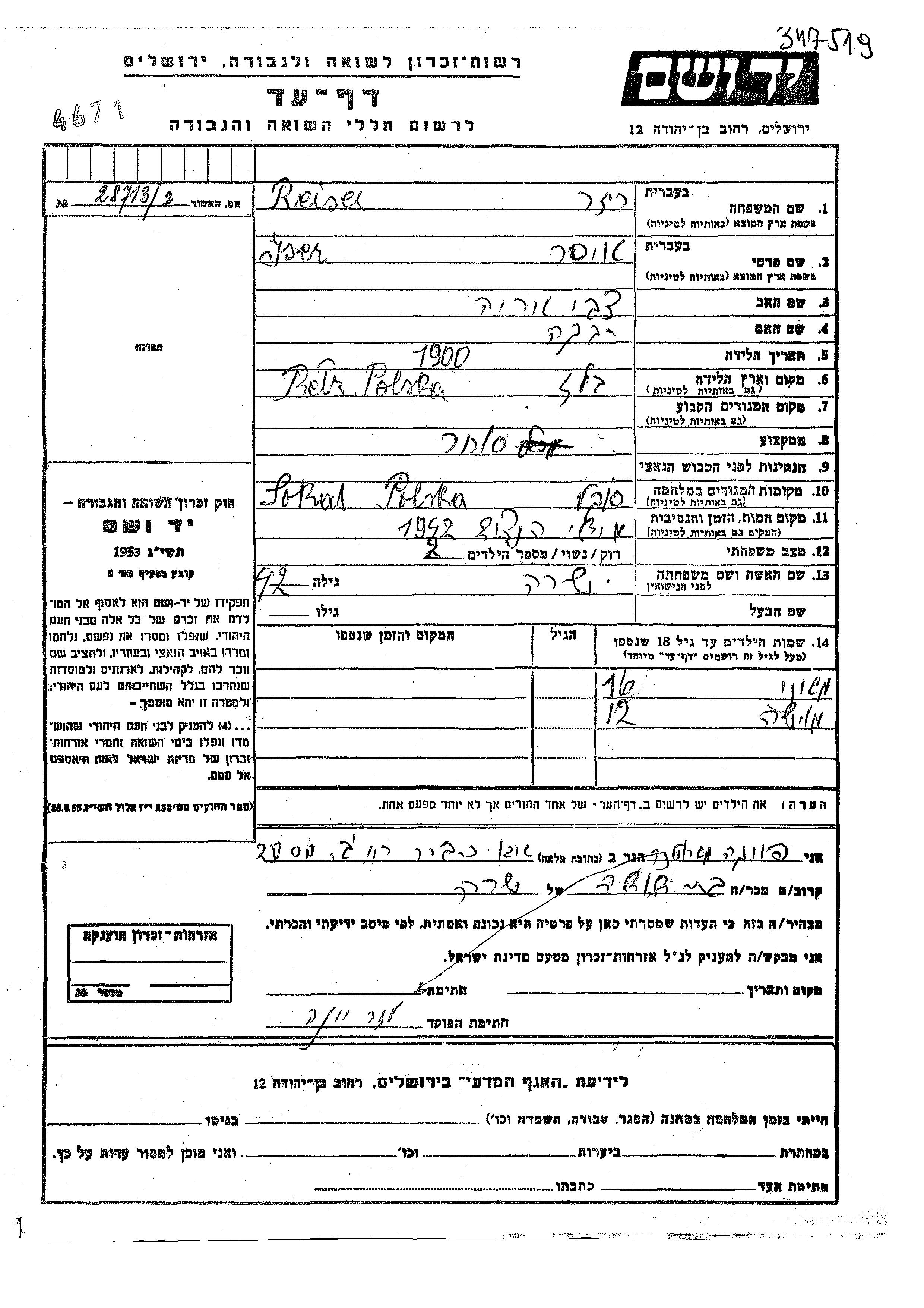 Isser Reiser Rizer wurde im Jahr 1900 in Belz, Polen geboren. Er war der Sohn von Tzvi Arie und Rivka. Er war Kaufmann/-frau und mit Sara Verheiratet. Während des Krieges war er in Sokal, Polen.