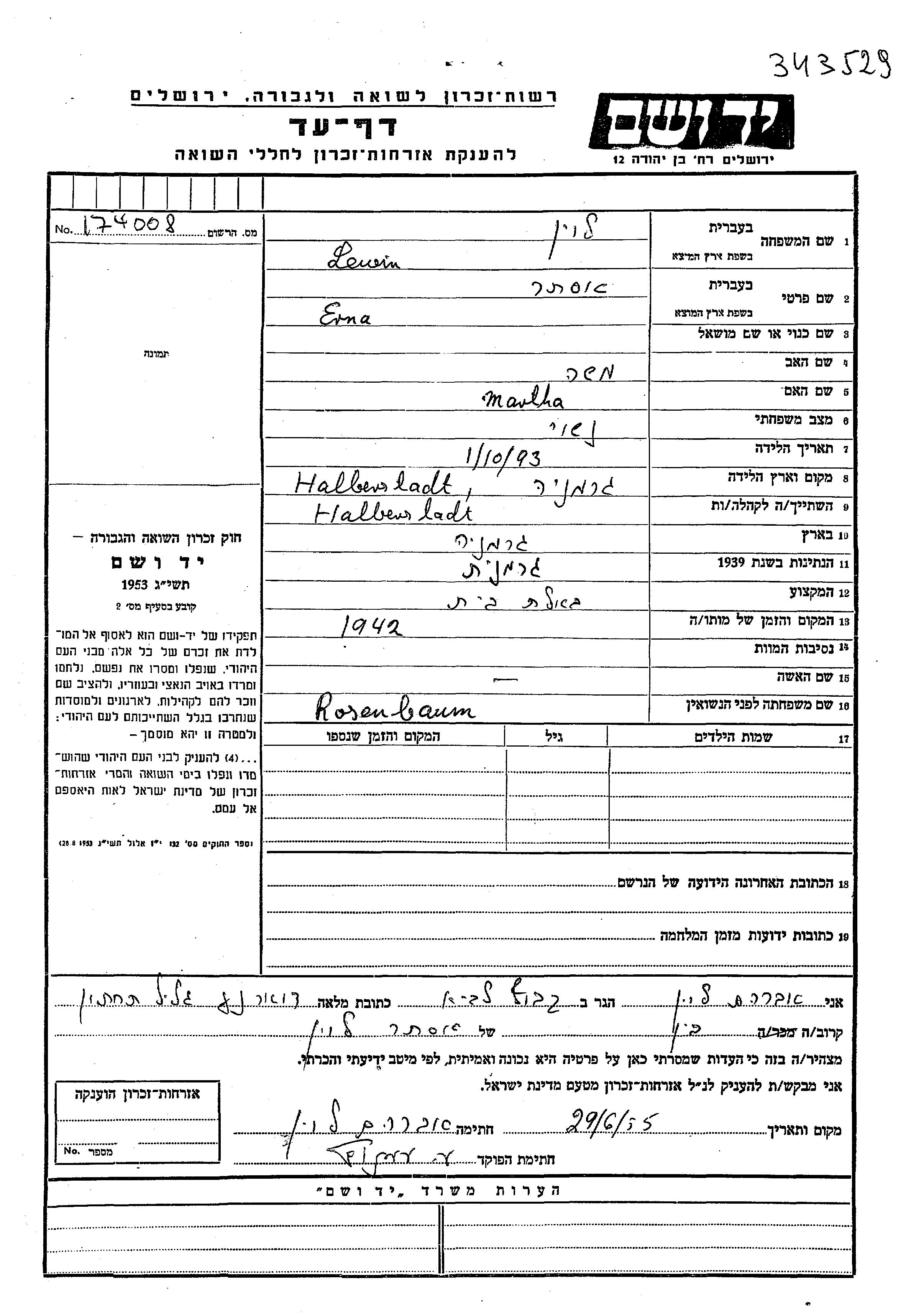 Erna Ester Lewin, geb. Rosenbaum wurde im Jahr 1893 in Halberstadt, Deutsches Reich geboren. Sie war die Tochter von Moshe und Marta. Sie war Hausfrau und Verheiratet. Vor dem Zweiten Weltkrieg lebte sie in Halberstadt, Deutsches Reich.