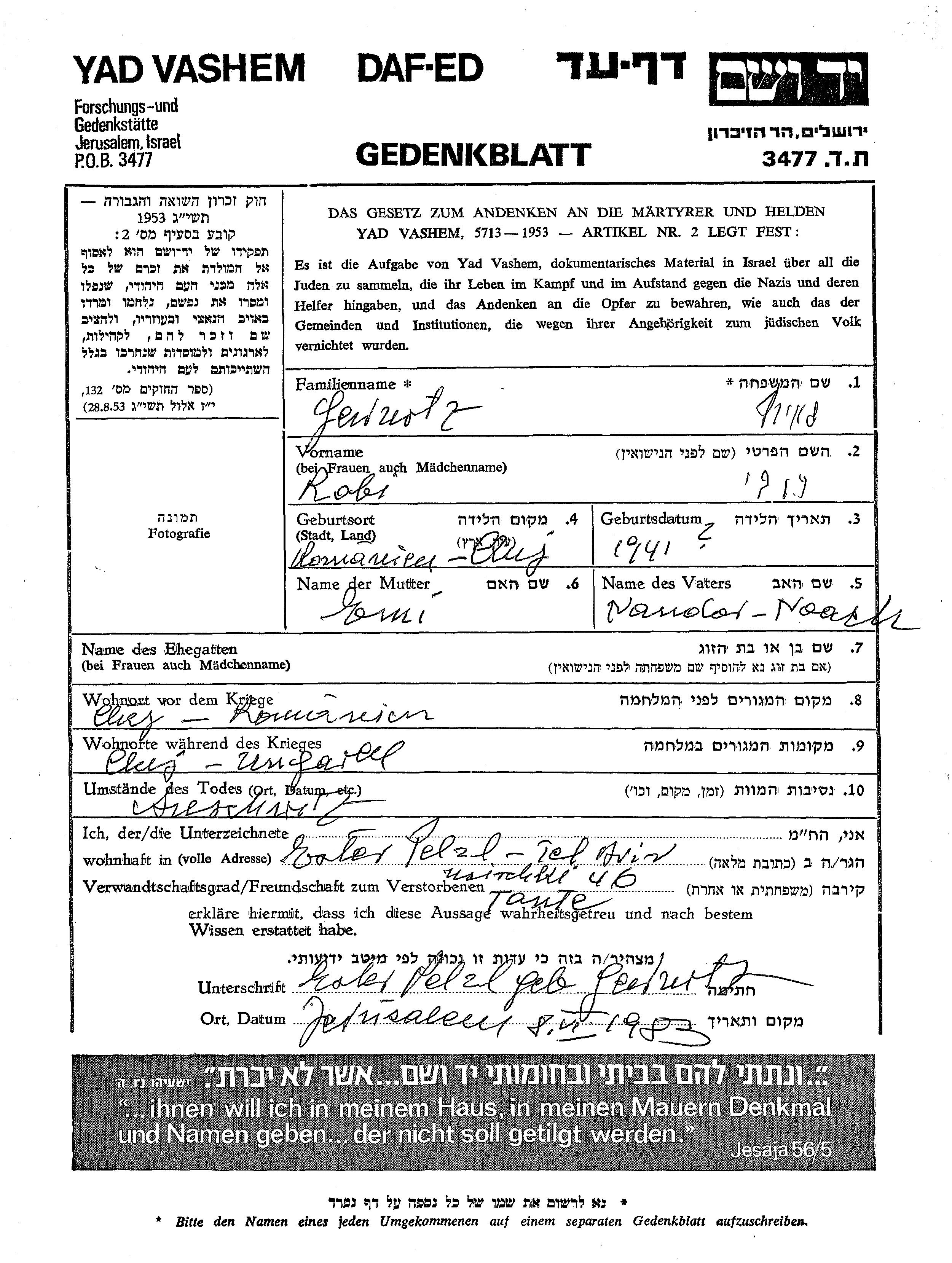 Robi wurde in der Schoah ermordet. Todesort: Auschwitz, Polen.