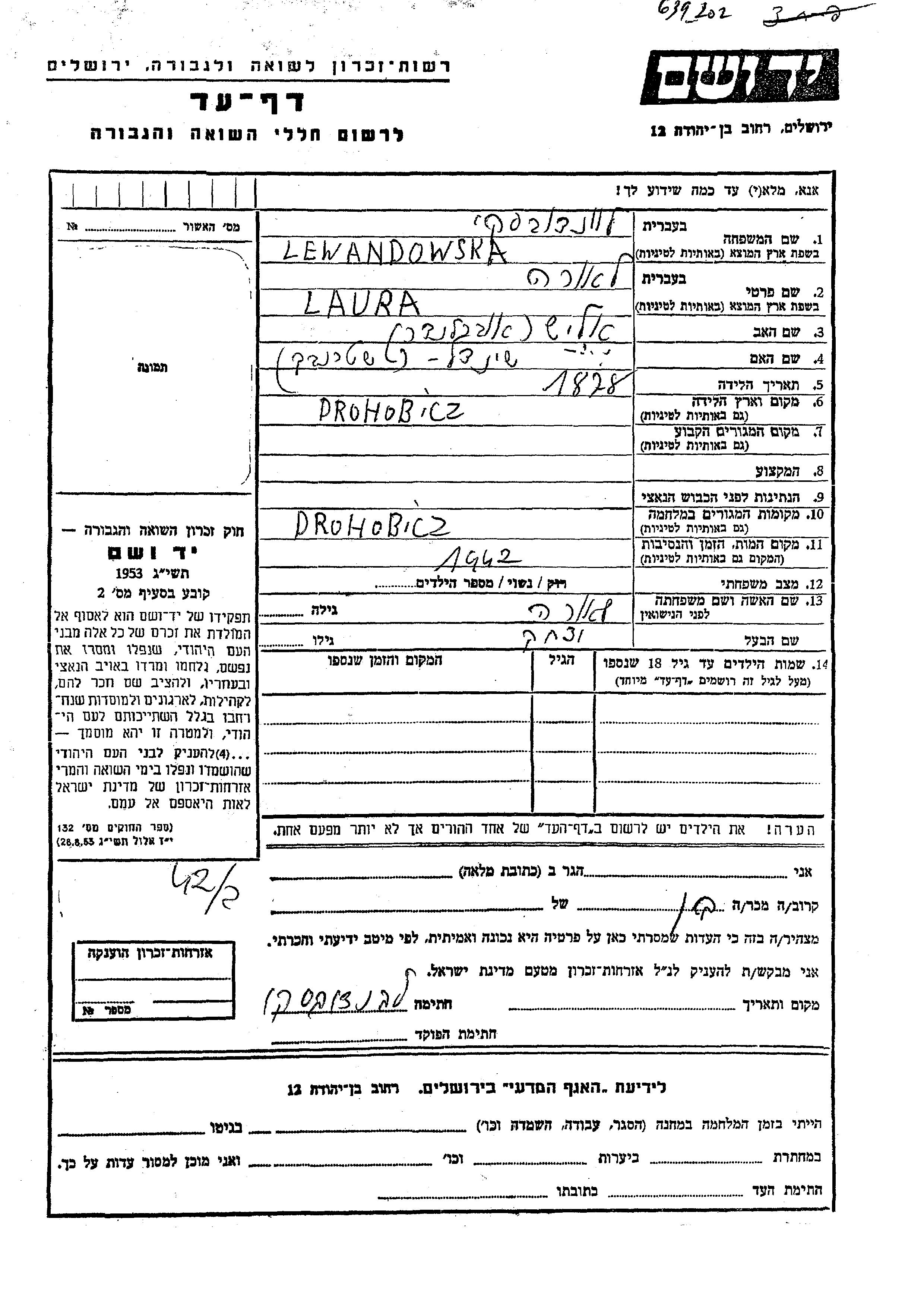 Laura Lewandowski, geb. Oberlender wurde im Jahr 1878 in Drohobycz, Polen geboren. Sie war die Tochter von Elish und Sheindl. Sie war mit Yitzkhak Verheiratet. Während des Krieges war sie in Drohobycz, Polen.