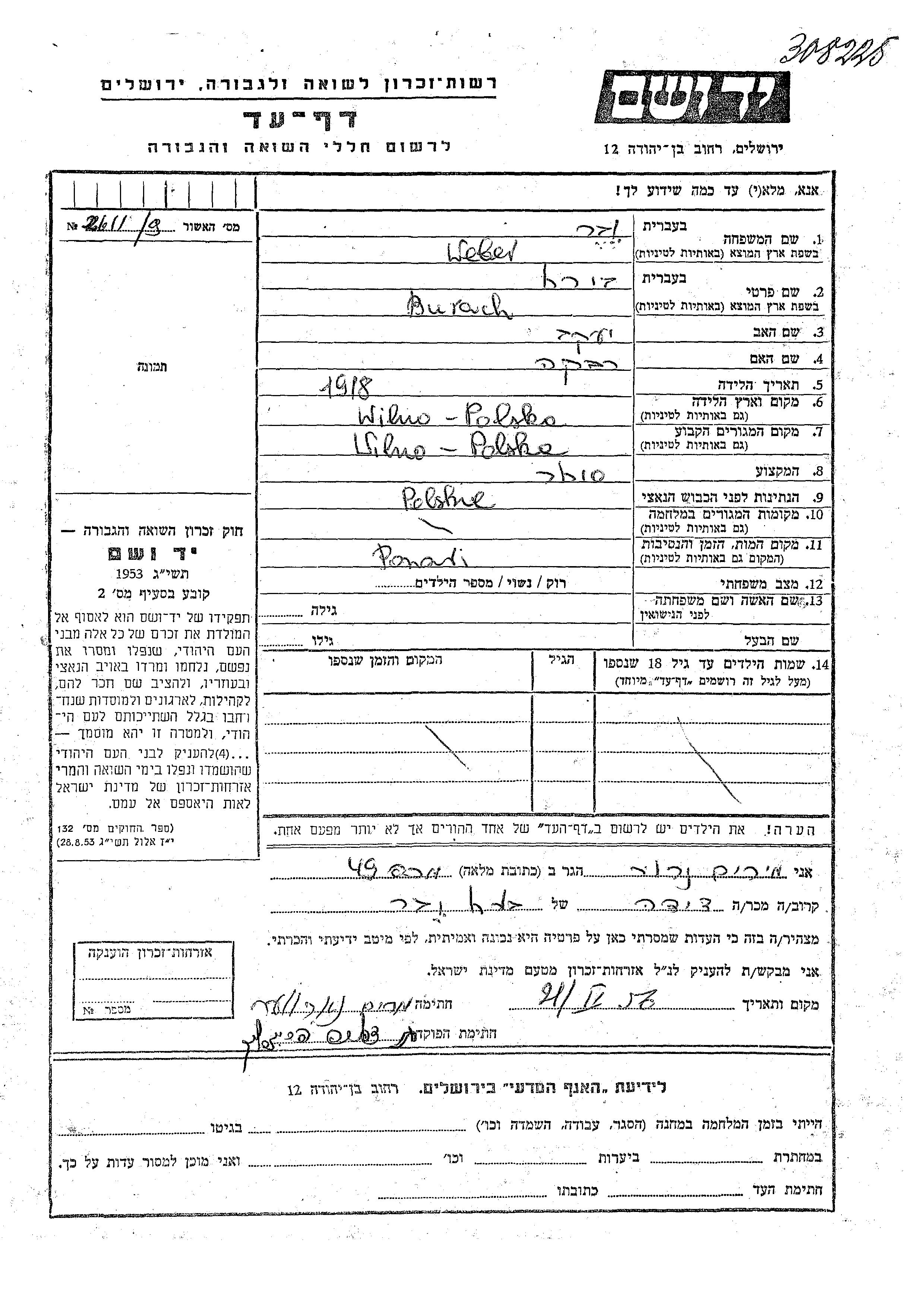 Burach Weber Vaver wurde im Jahr 1918 in Wilno, Polen geboren. Er war der Sohn von Yaakov und Rivka. Er war Kaufmann/-frau. Vor dem Zweiten Weltkrieg lebte er in Wilno, Polen.