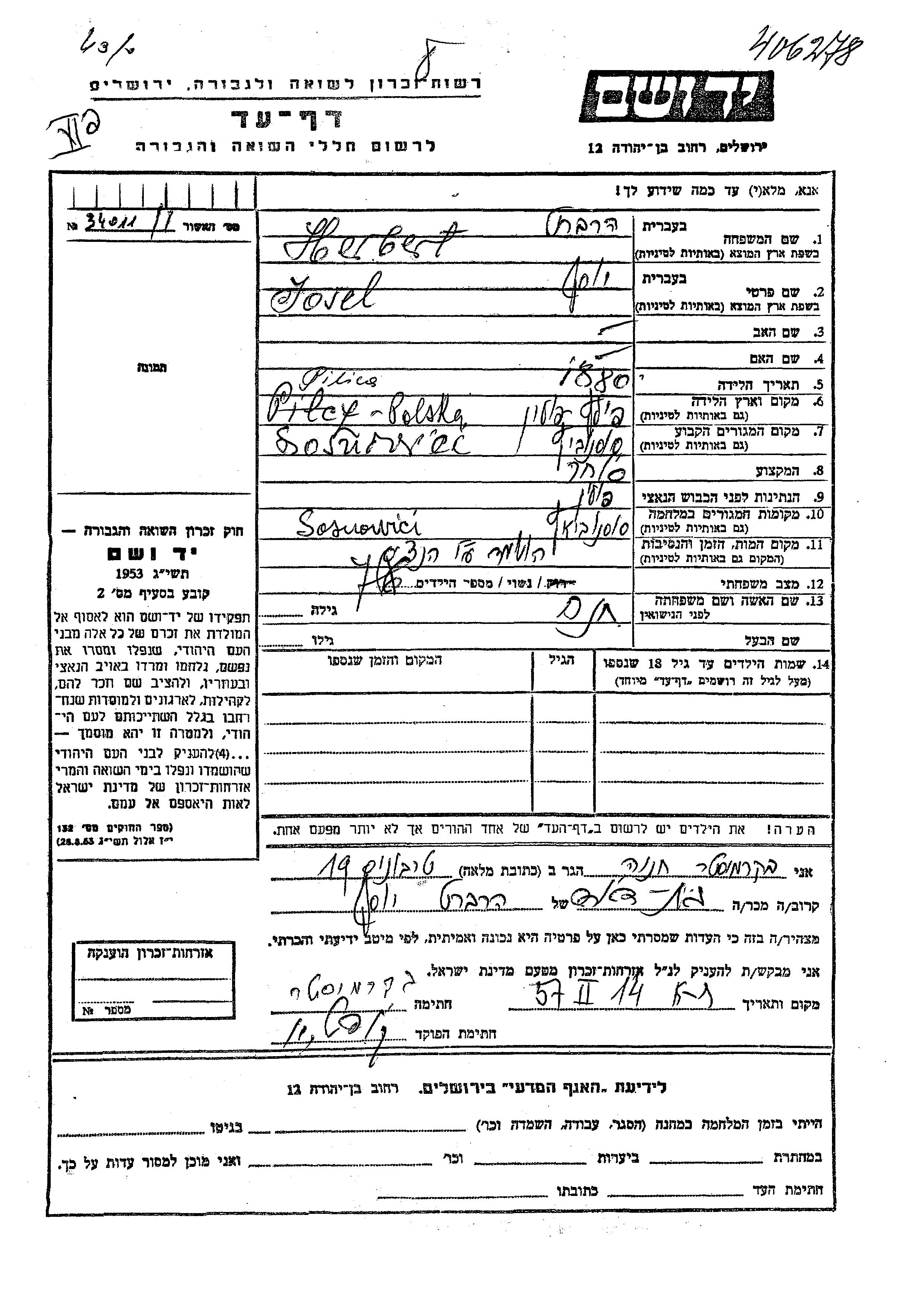 Josel Herbert wurde im Jahr 1880 in Pilica, Polen geboren. Er war Kaufmann/-frau und mit Khana Verheiratet. Vor dem Zweiten Weltkrieg lebte er in Sosnowiec, Polen. Während des Krieges war er in Sosnowiec, Polen.