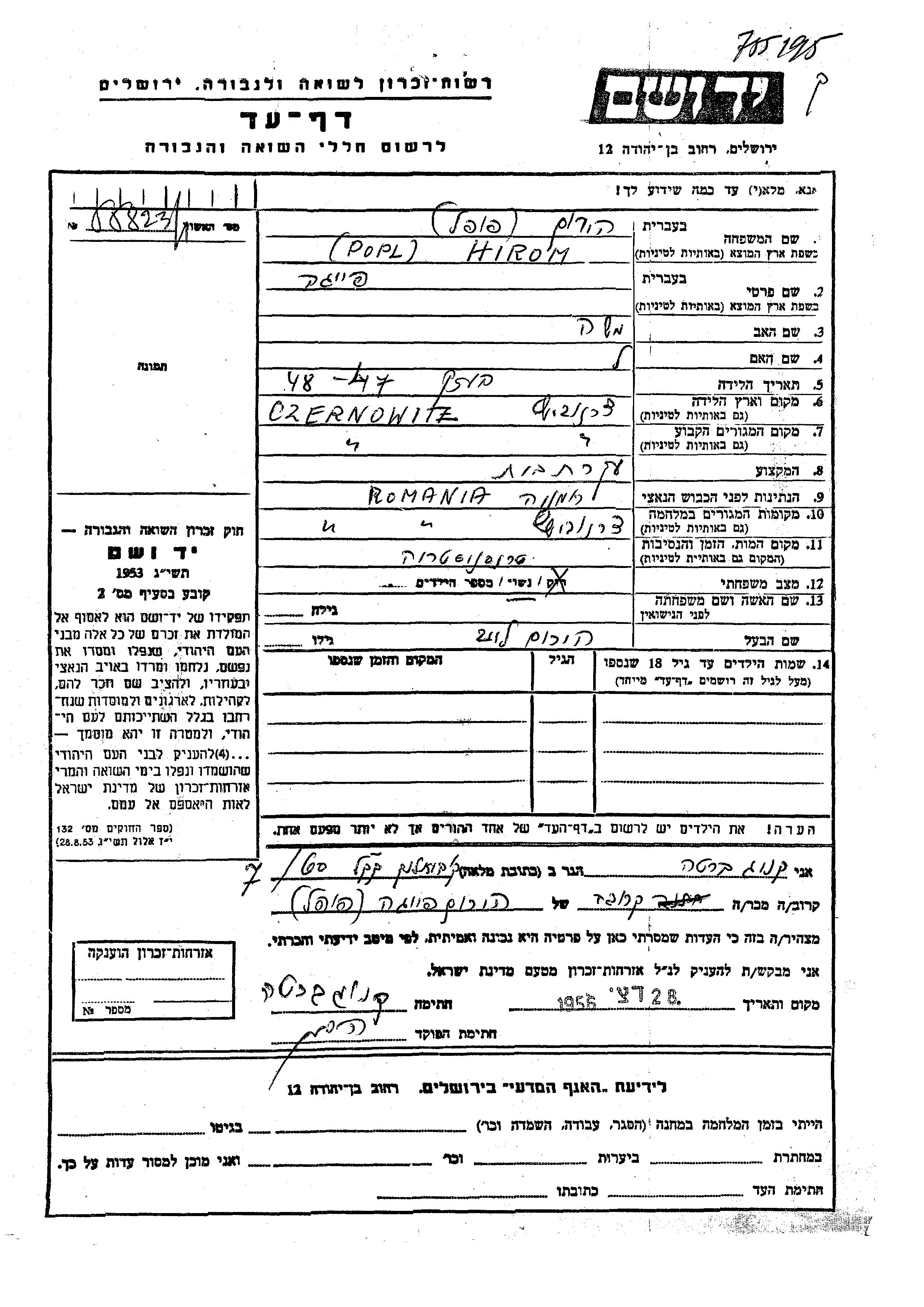 Feiga Hirom Popel, geb. Popl wurde in Czernowitz, Rumänien geboren. Sie war die Tochter von Moshe. Sie war Hausfrau und mit Leib Verheiratet. Vor dem Zweiten Weltkrieg lebte sie in Czernowitz, Rumänien. Während des Krieges war sie in Czernowitz, Rumänien.