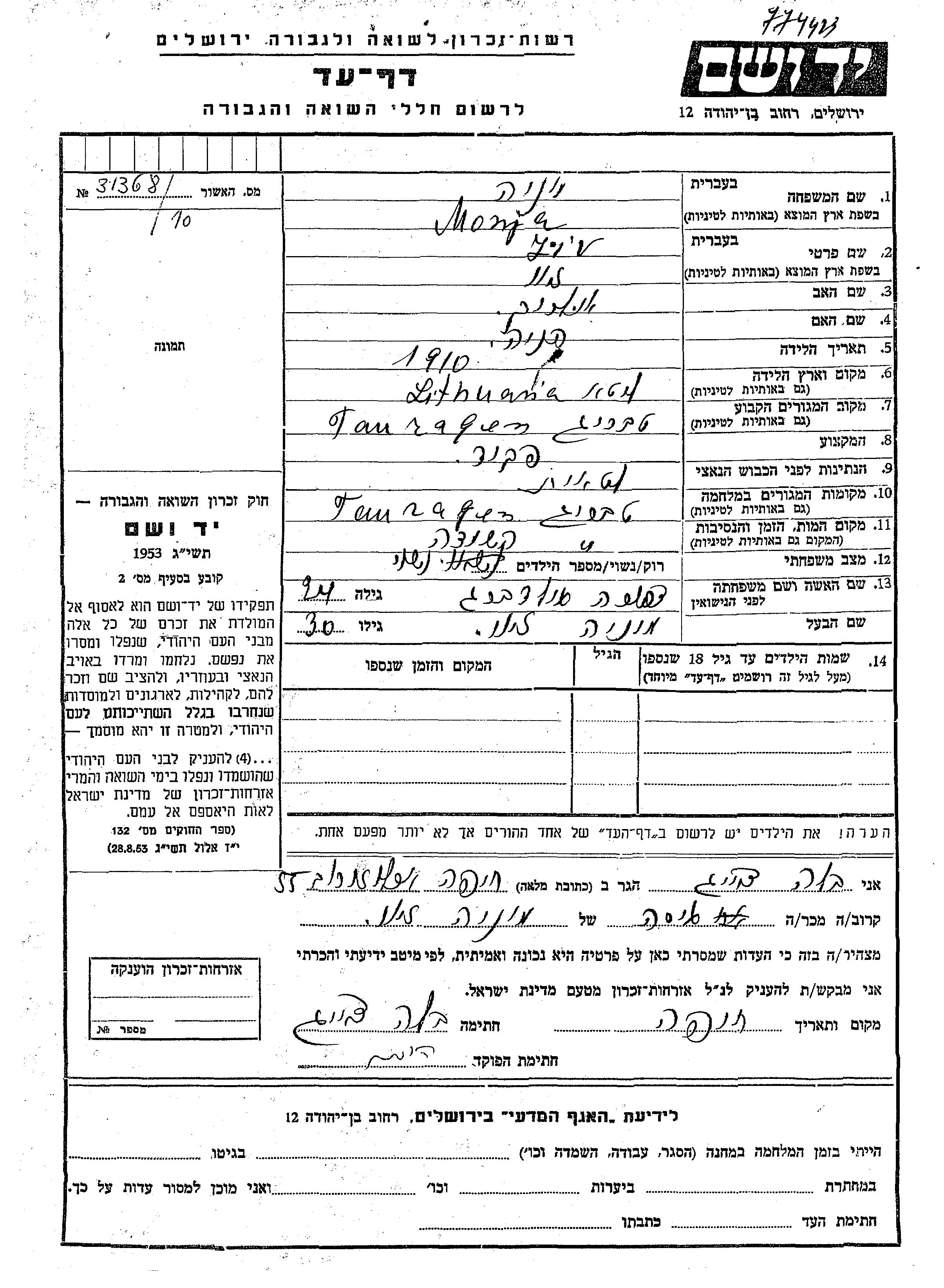 Monja Monia Ziv wurde im Jahr 1910 in Litauen geboren. Er war der Sohn von Ulrikh und Henia. Er war Angestellte/-r und mit Dvora, geb. Goldberg Verheiratet. Vor dem Zweiten Weltkrieg lebte er in Taurage, Litauen. Während des Krieges war er in Taurage, Litauen.