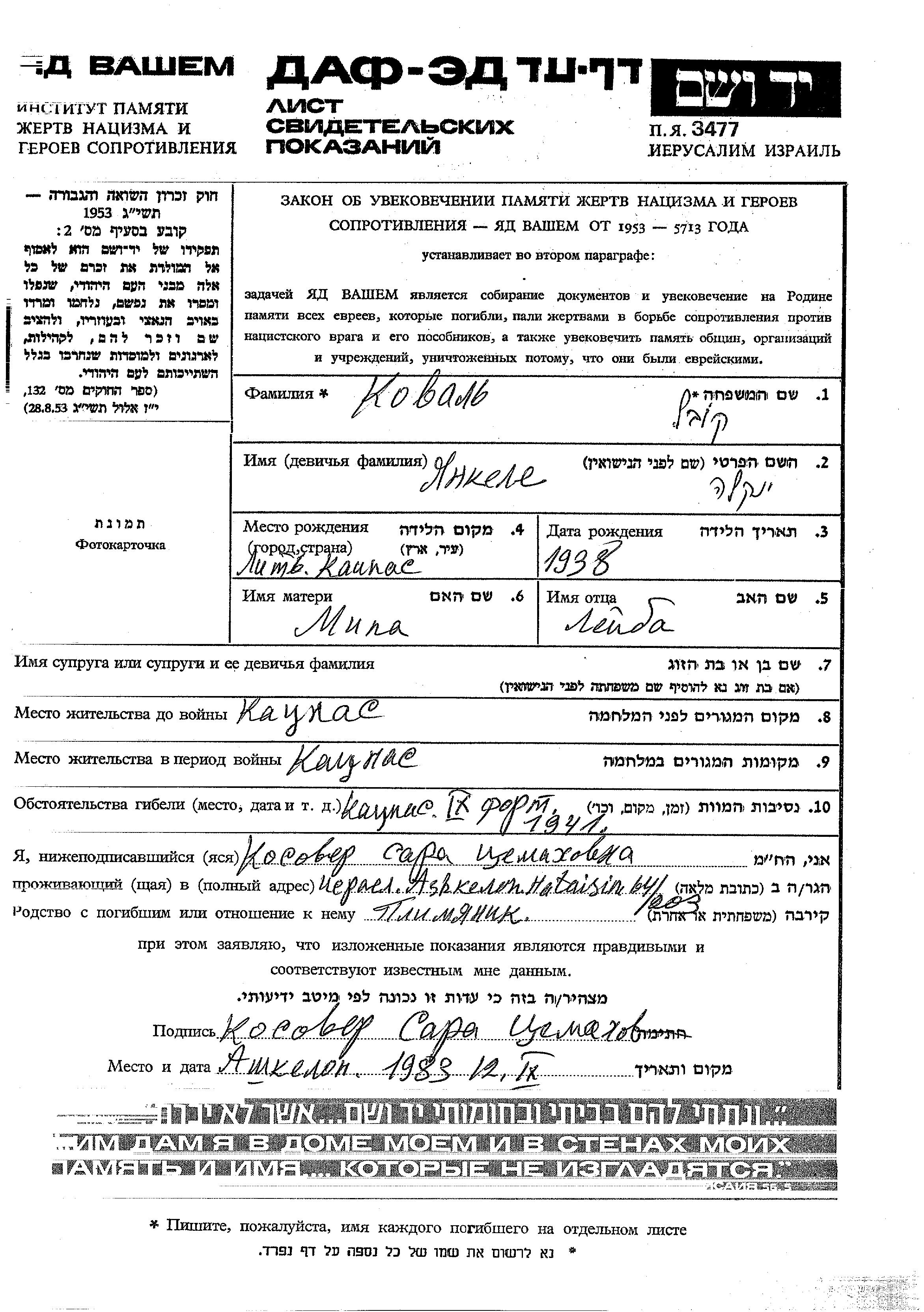 Yankele Koval Kubel wurde im Jahr 1938 in Kaunas, Litauen geboren. Er war der Sohn von Leiba und Mila. Er war Ledig. Vor dem Zweiten Weltkrieg lebte er in Kaunas, Litauen. Während des Krieges war er in Kaunas, Litauen.