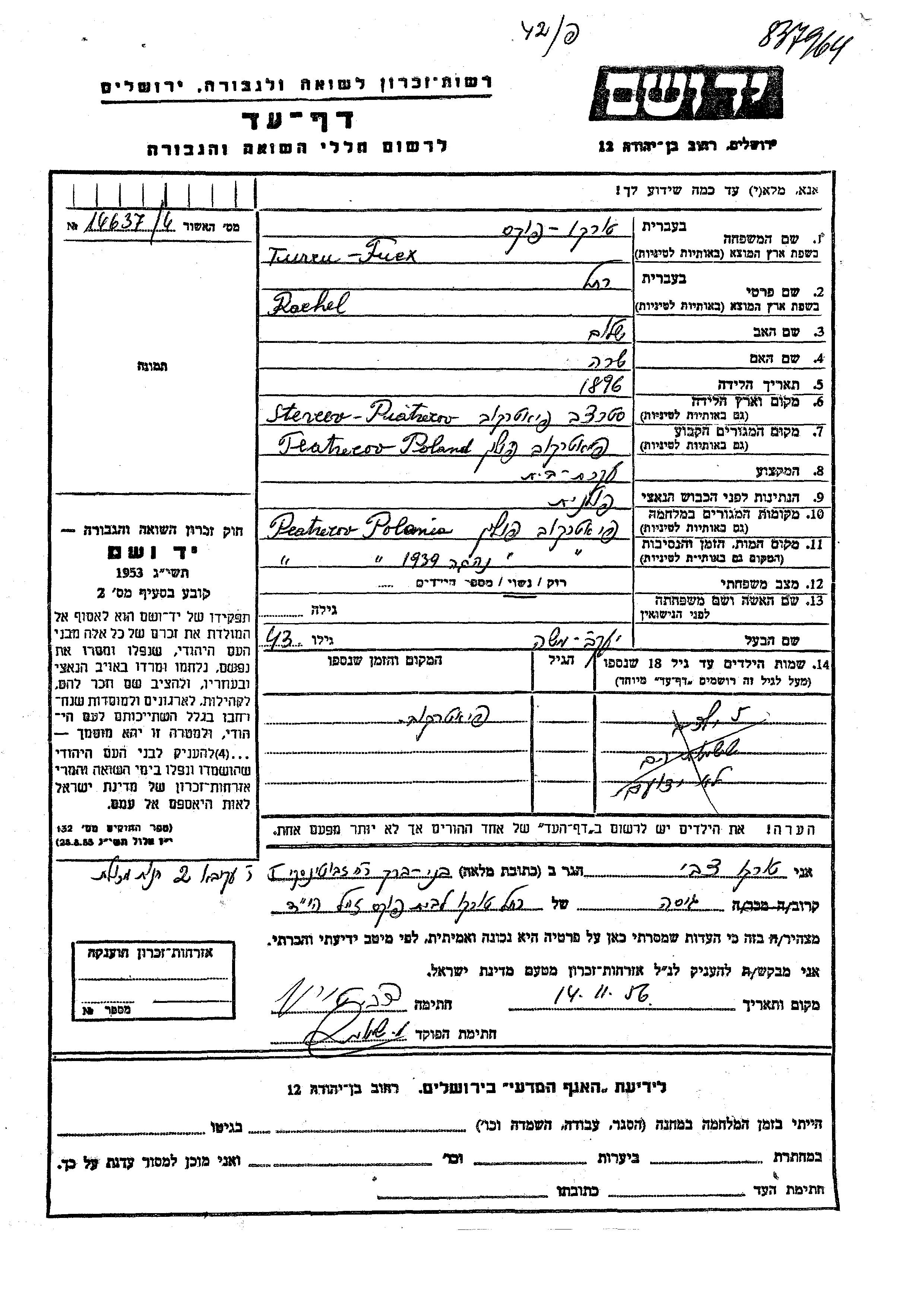Rachel Turcu Fuchs wurde im Jahr 1896 in Piotrkow, Polen geboren. Sie war die Tochter von Shalom und Sara. Sie war Hausfrau und mit Yaakov Moshe Verheiratet. Vor dem Zweiten Weltkrieg lebte sie in Peatrecov, Polen. Während des Krieges war sie in Piotrkow, Polen.