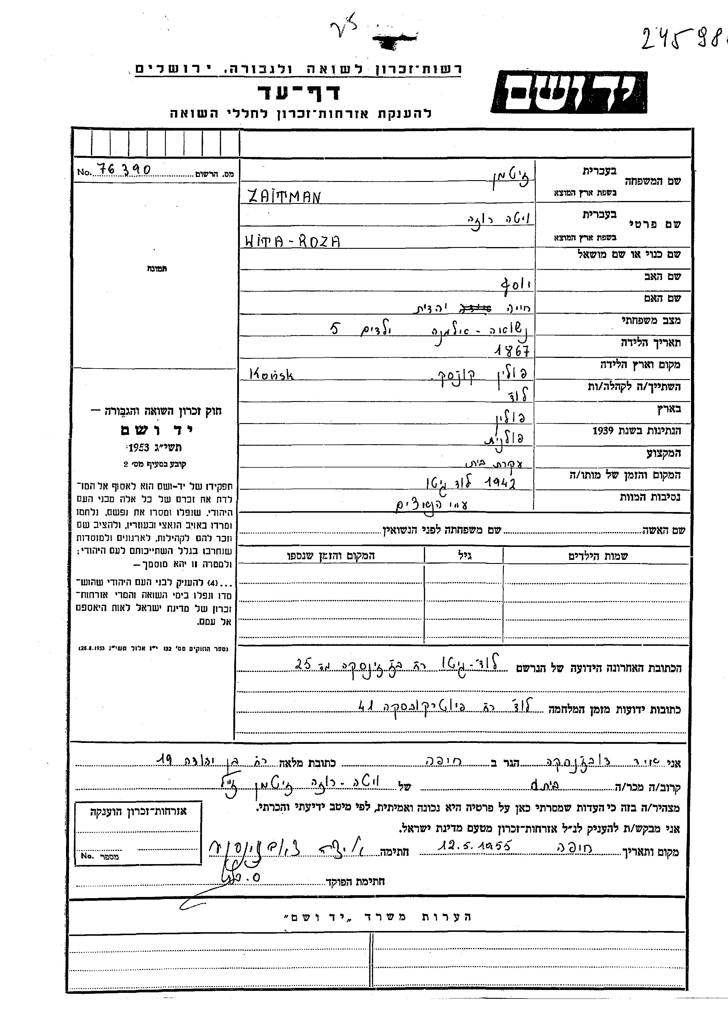 Wita Roza Zaitman Zitman wurde im Jahr 1867 in Konsk, Polen geboren. Sie war die Tochter von Yosef und Khaia Yehudit. Sie war Hausfrau und Witwe. Vor dem Zweiten Weltkrieg lebte sie in Lodz, Polen. Während des Krieges war sie in Lodz, Polen.