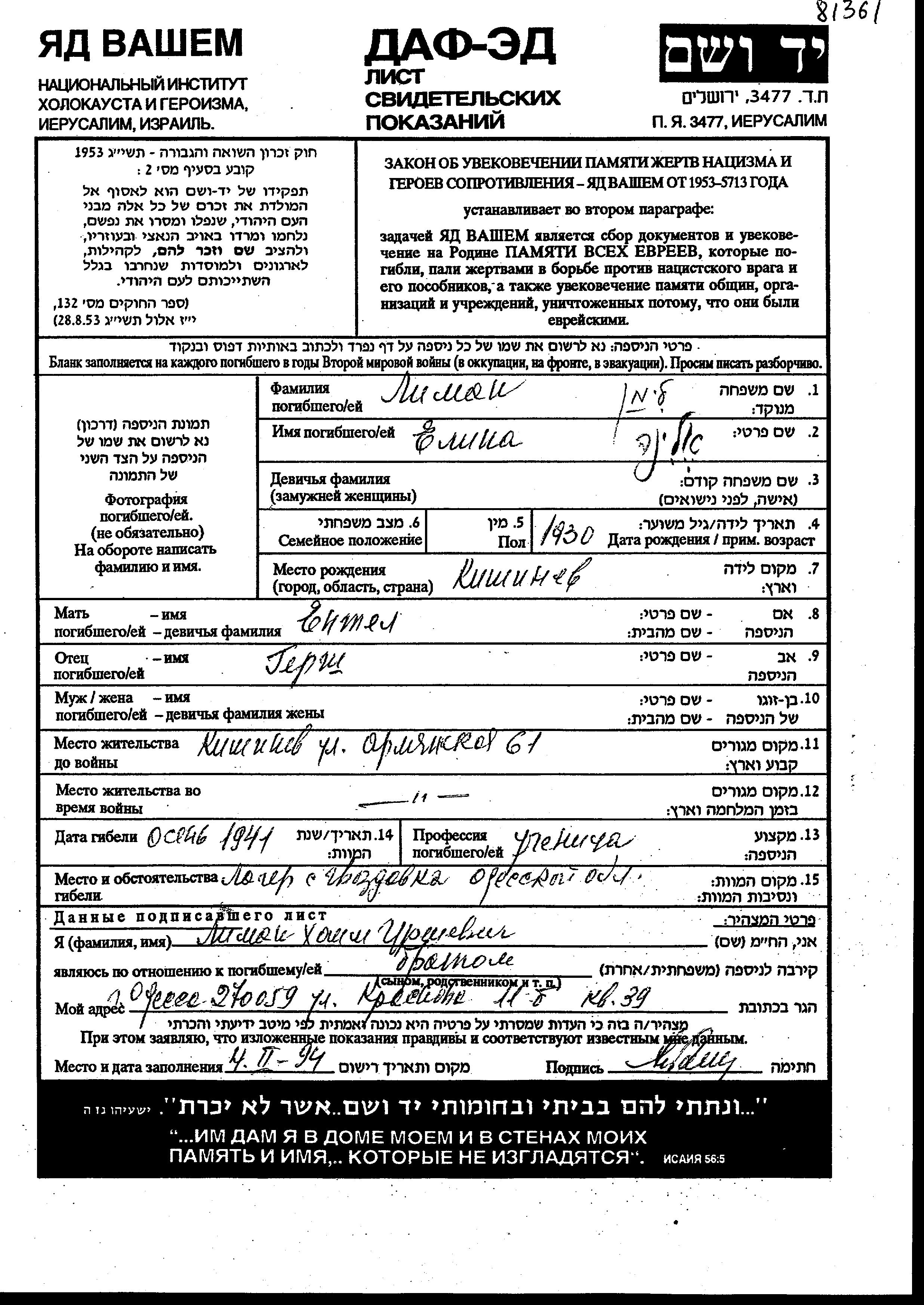Yelina Alina Liman wurde im Jahr 1930 in Kishinev, Rumänien geboren. Sie war die Tochter von Gersh und Yentel. Sie war Schüler/-in. Vor dem Zweiten Weltkrieg lebte sie in Kishinev, Rumänien. Während des Krieges war sie in Kishinev, Rumänien.