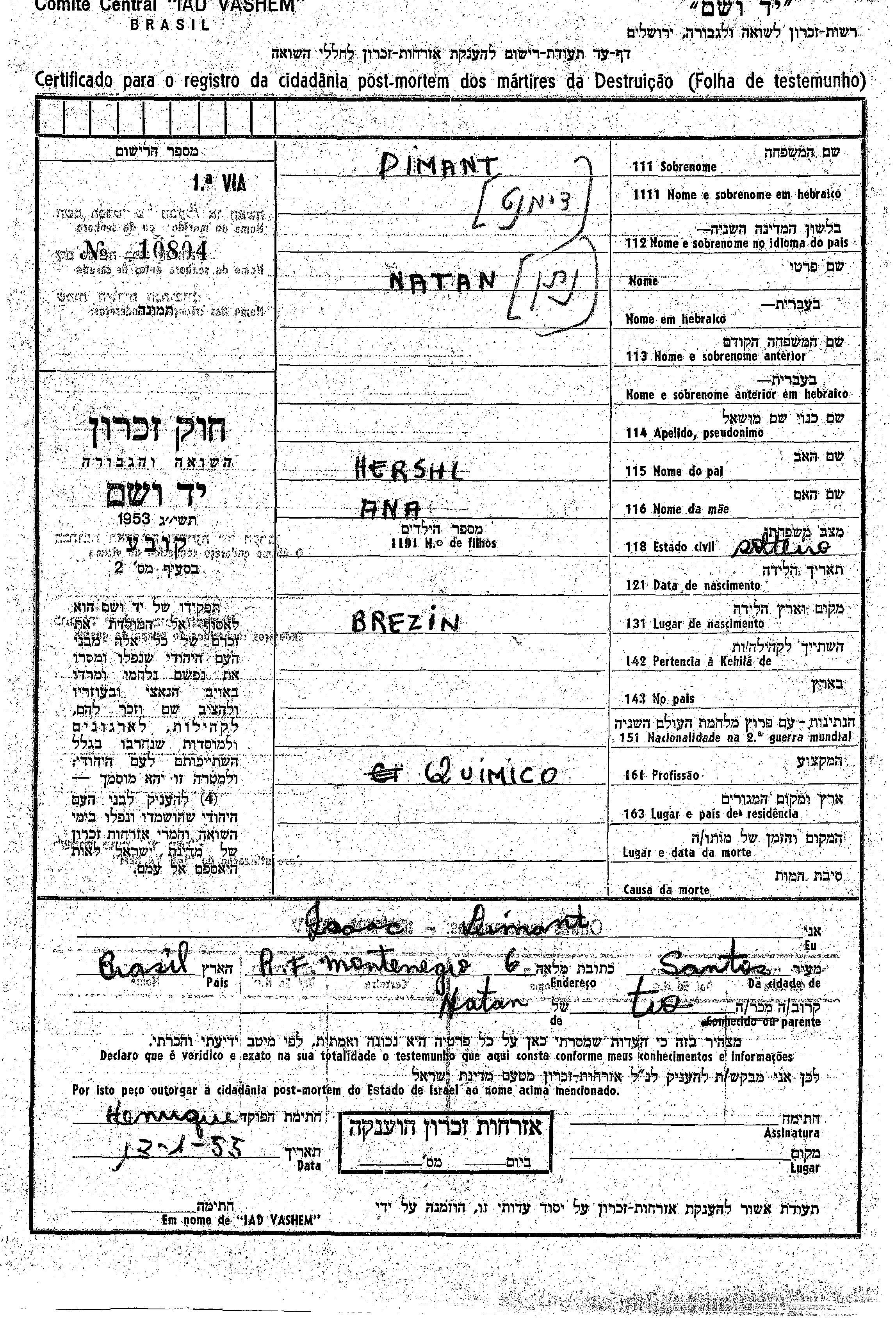 Natan Dimant wurde in Breziny, Polen geboren. Er war der Sohn von Hershl. Er war Quimico und Ledig.