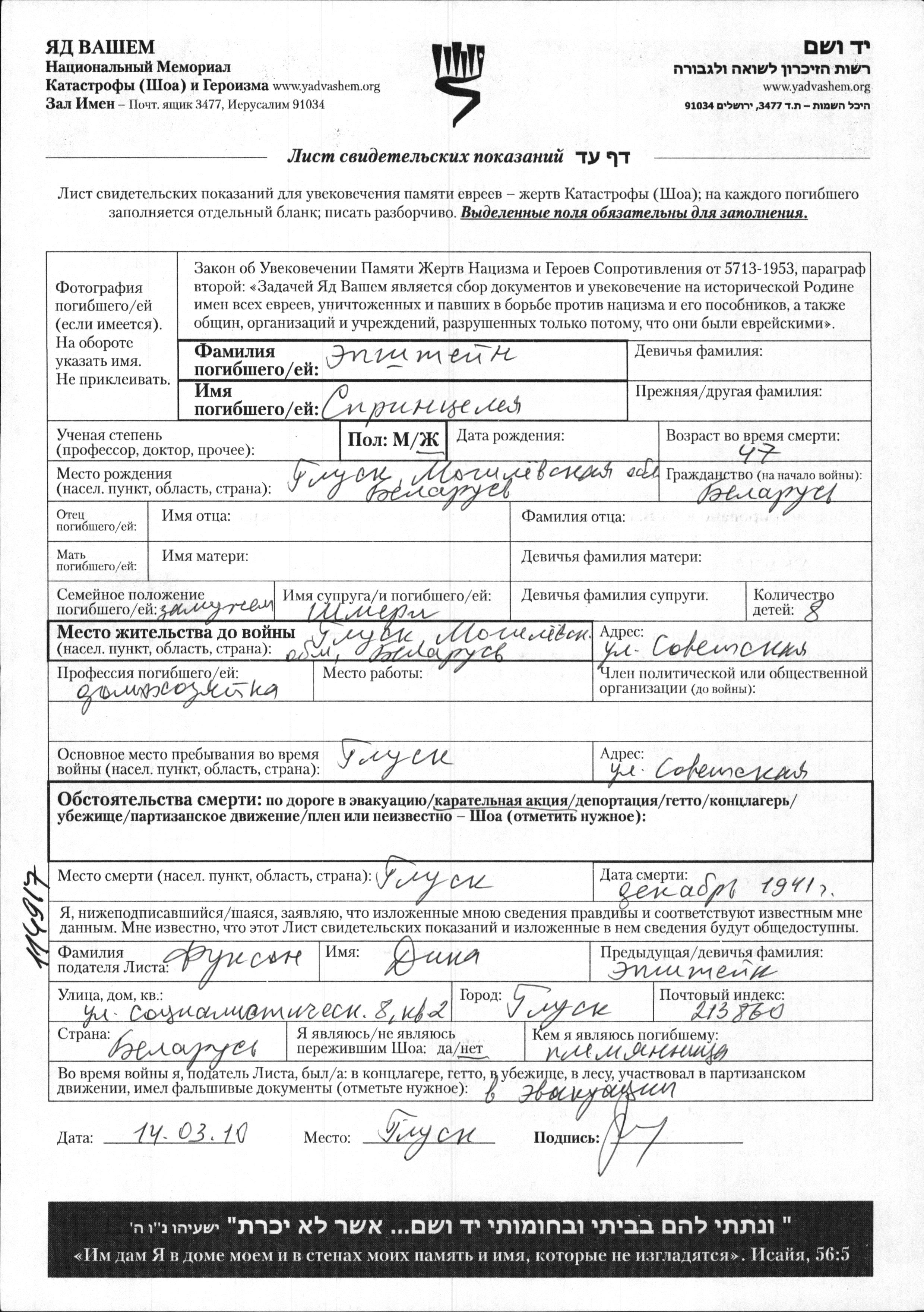 Sprintze Lea Epshteyn wurde in Glusk, Weißrussland (UdSSR) geboren. Sie war Hausfrau und mit Shmerl Verheiratet. Vor dem Zweiten Weltkrieg lebte sie in Glusk, Weißrussland (UdSSR). Während des Krieges war sie in Glusk, Weißrussland (UdSSR).