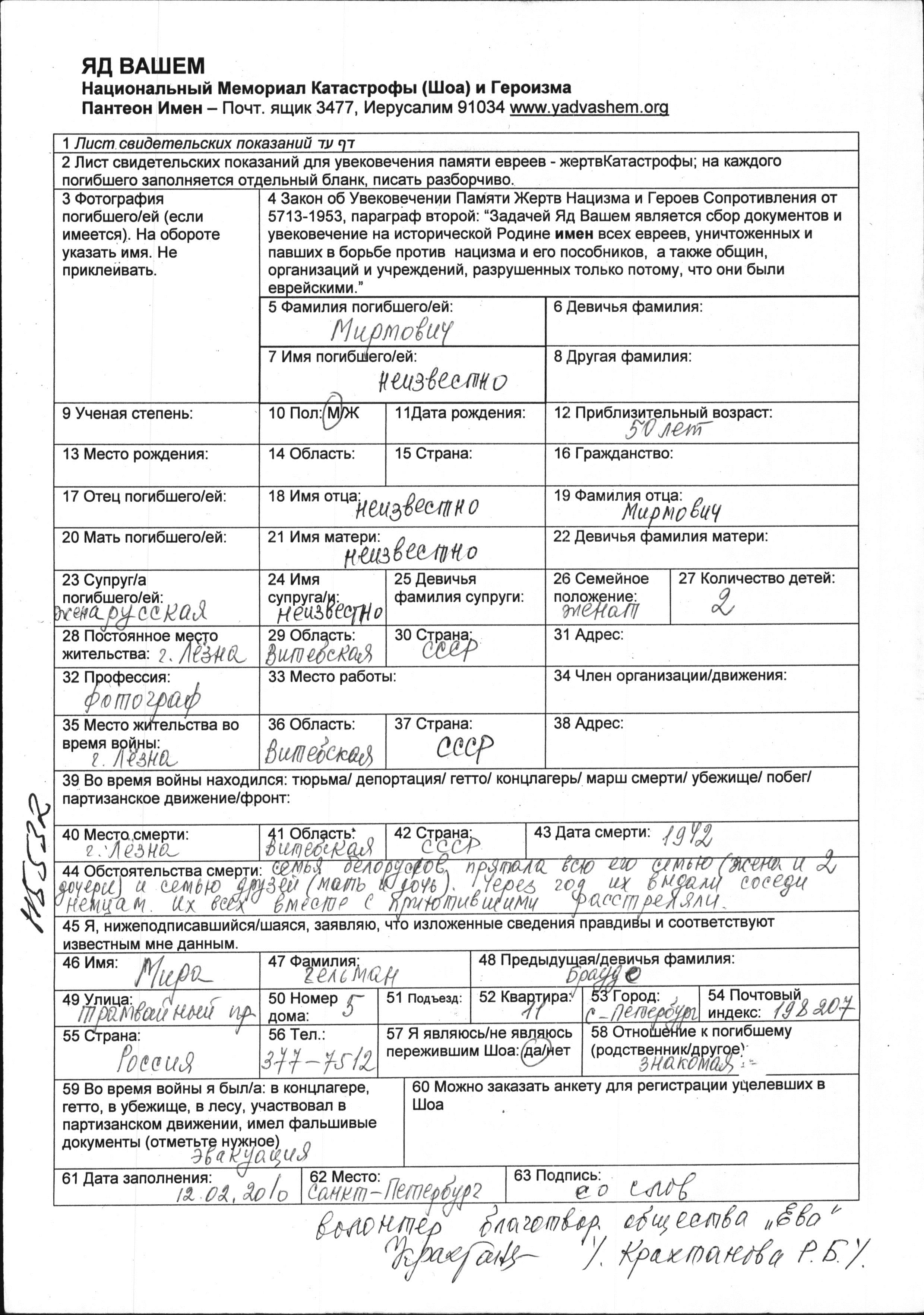 Vorname unbekannt Mirmovich. Er war Fotograf/-in und Verheiratet. Vor dem Zweiten Weltkrieg lebte er in Lezna, Weißrussland (UdSSR). Während des Krieges war er in Lezna, Weißrussland (UdSSR).