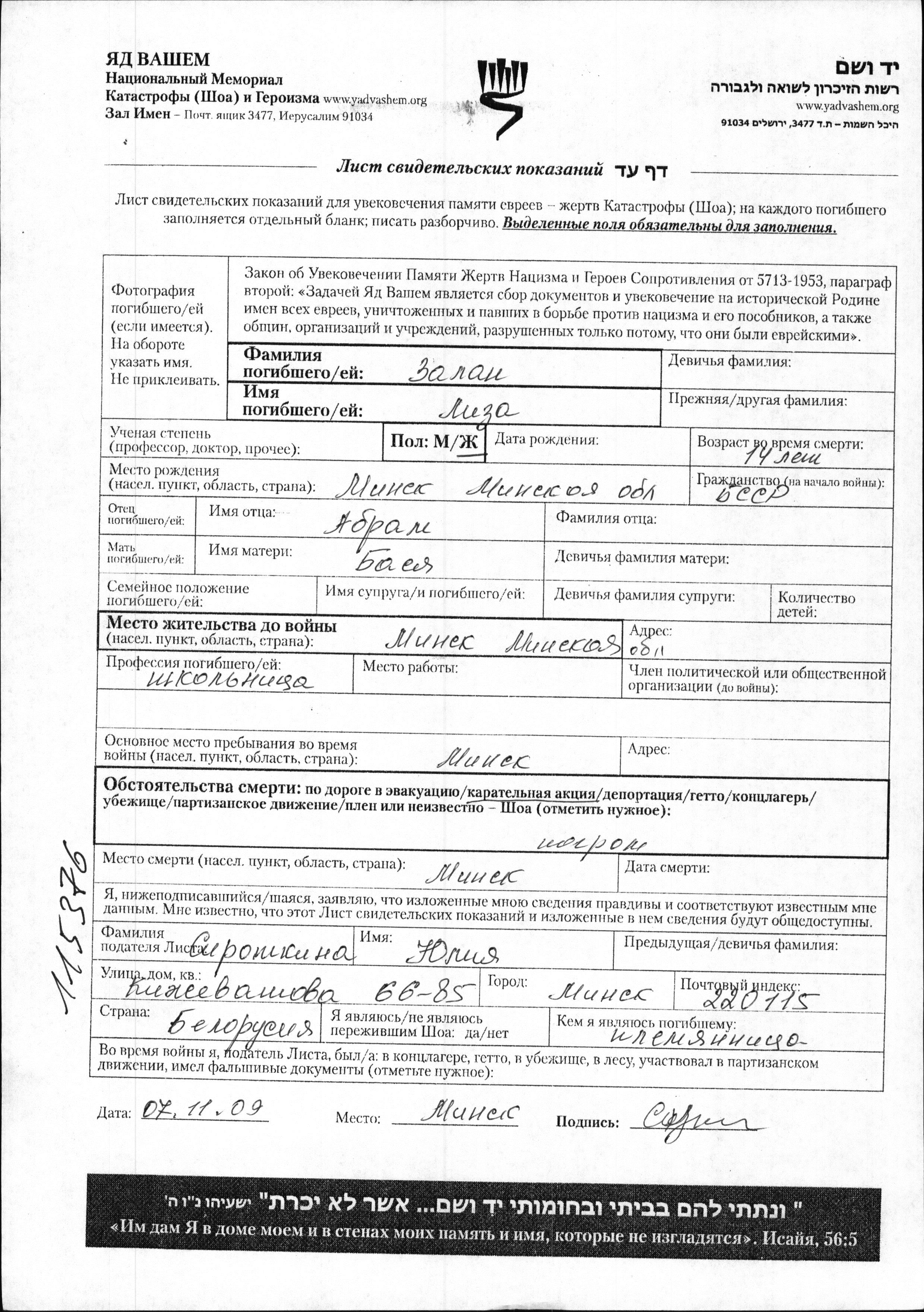 Liza Zalan wurde in Minsk, Weißrussland (UdSSR) geboren. Sie war die Tochter von Abram und Basya. Sie war Schüler/-in und Jugendliche/-r. Vor dem Zweiten Weltkrieg lebte sie in Minsk, Weißrussland (UdSSR). Während des Krieges war sie in Minsk, Weißrussland (UdSSR).