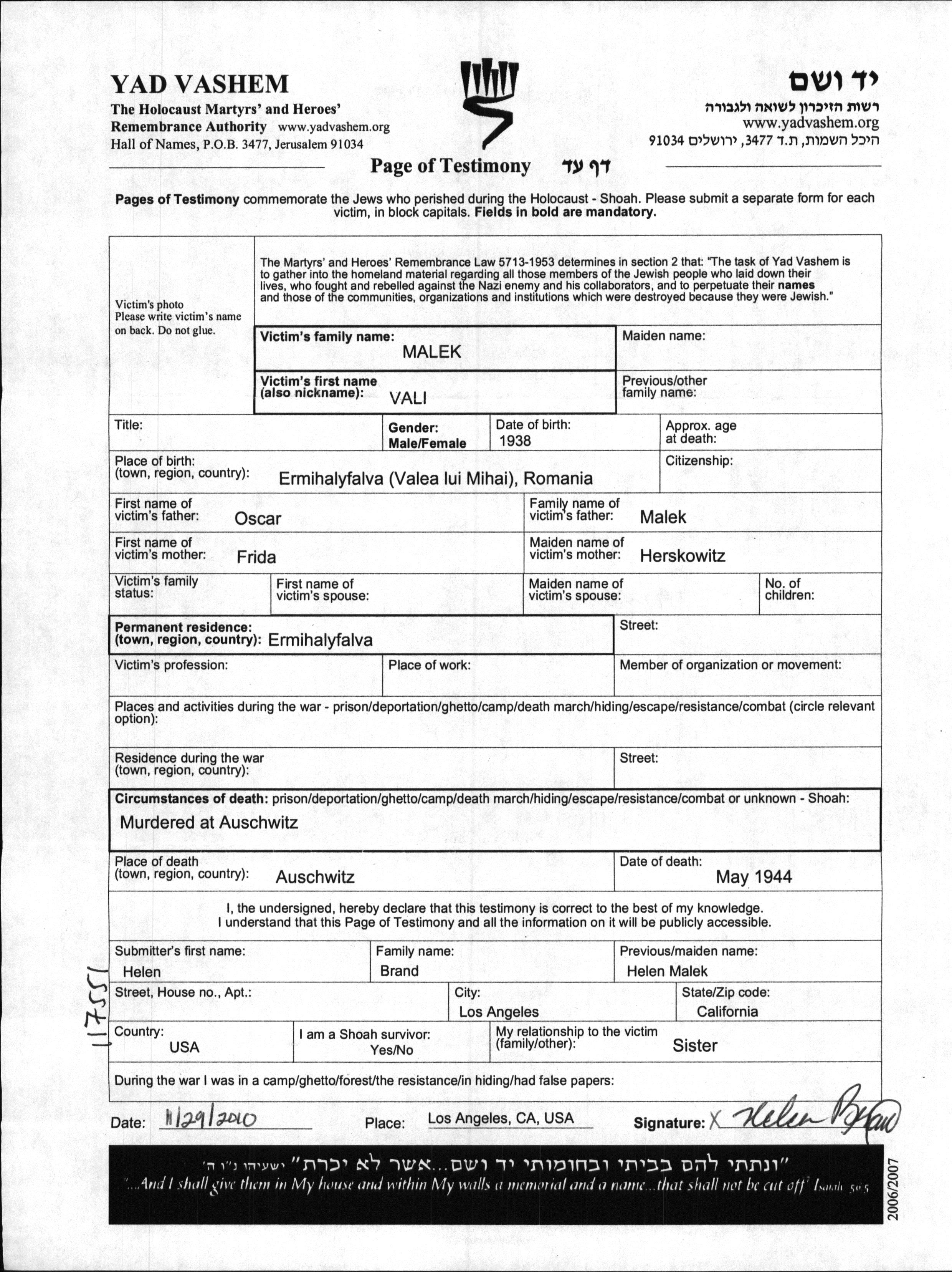 Vali wurde in der Schoah ermordet. Todesort: Auschwitz, Polen im Jahr 05/1944.