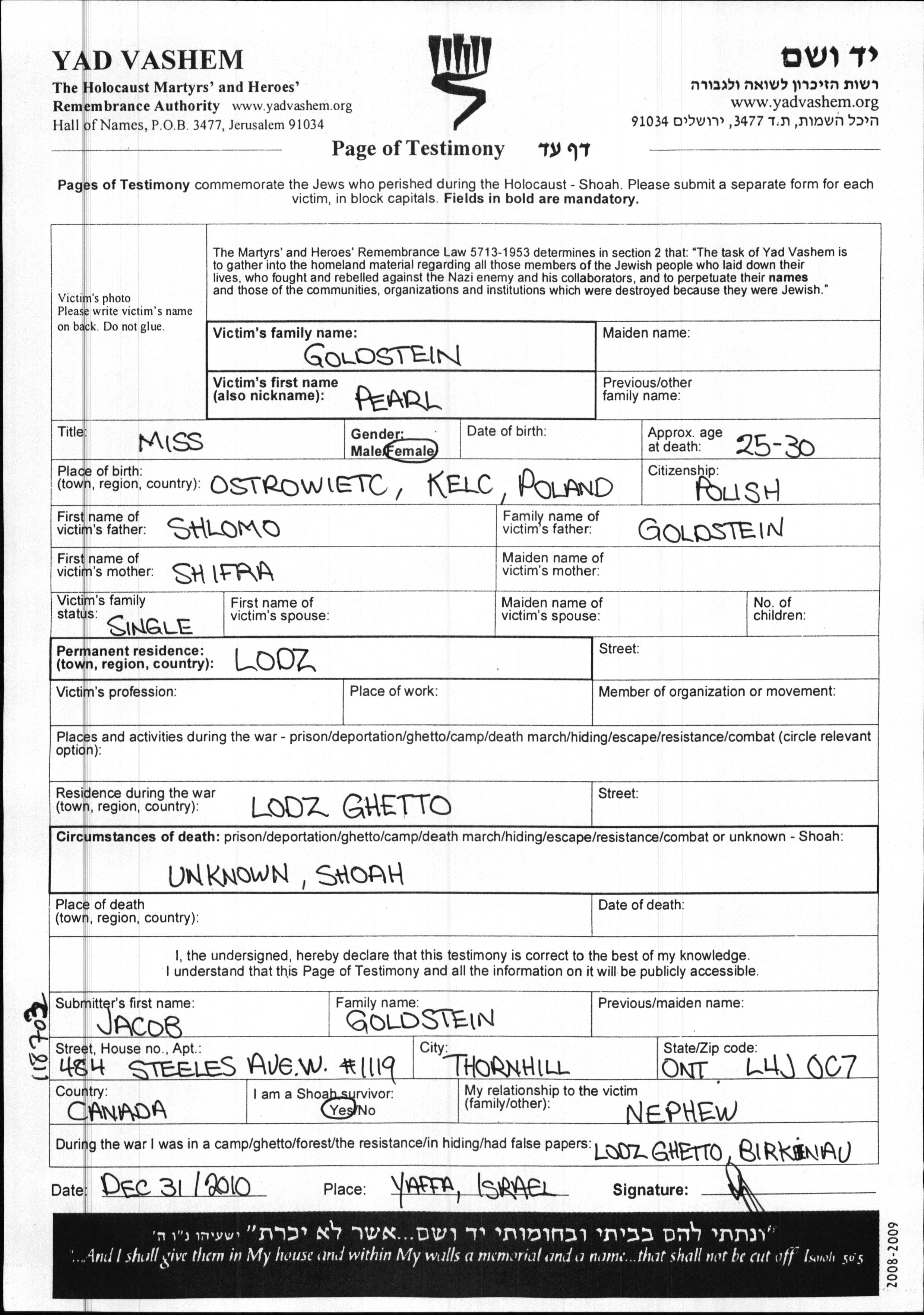 Goldstein Pearl Lodz, Polen Gedenkblatt
