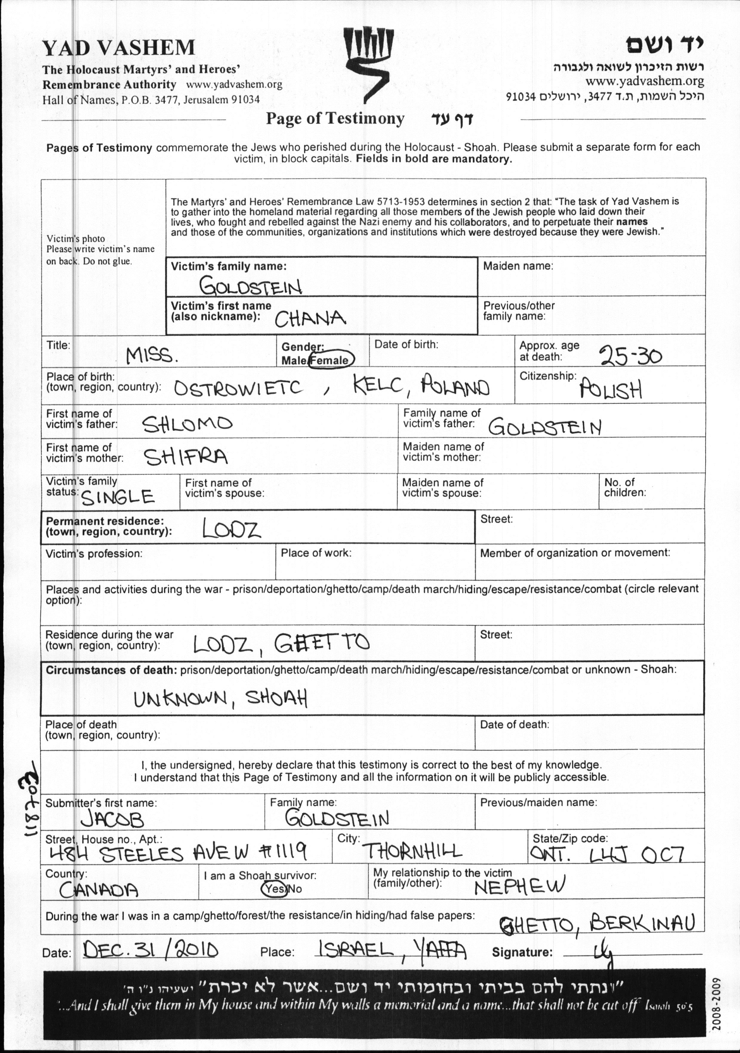 Chana Goldstein wurde in Ostrowiec, Polen geboren. Sie war die Tochter von Shlomo und Shifra. Sie war Ledig. Vor dem Zweiten Weltkrieg lebte sie in Lodz, Polen. Während des Krieges war sie in Lodz, Polen.