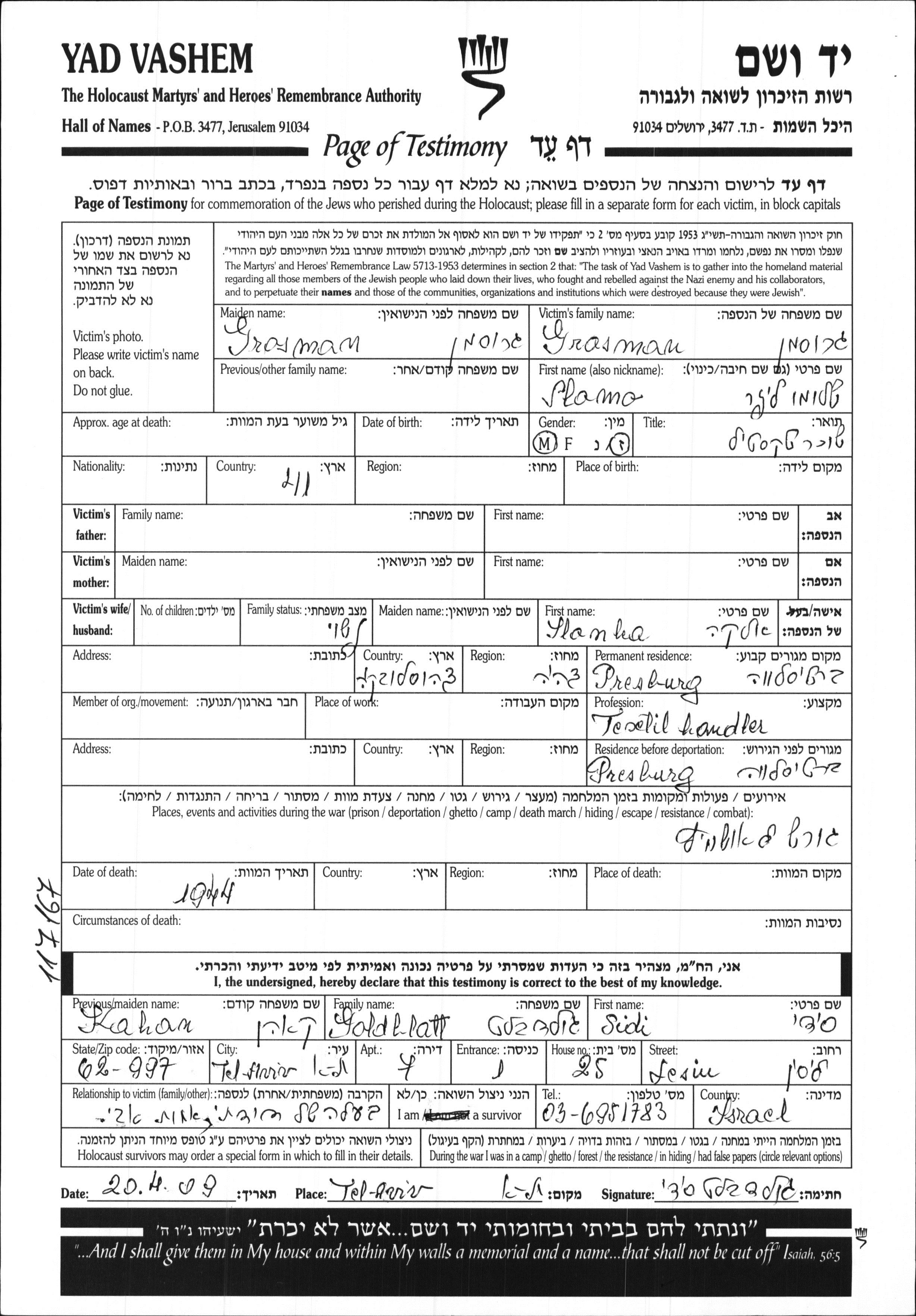 Aufenthaltsort während des Krieges/Schoah