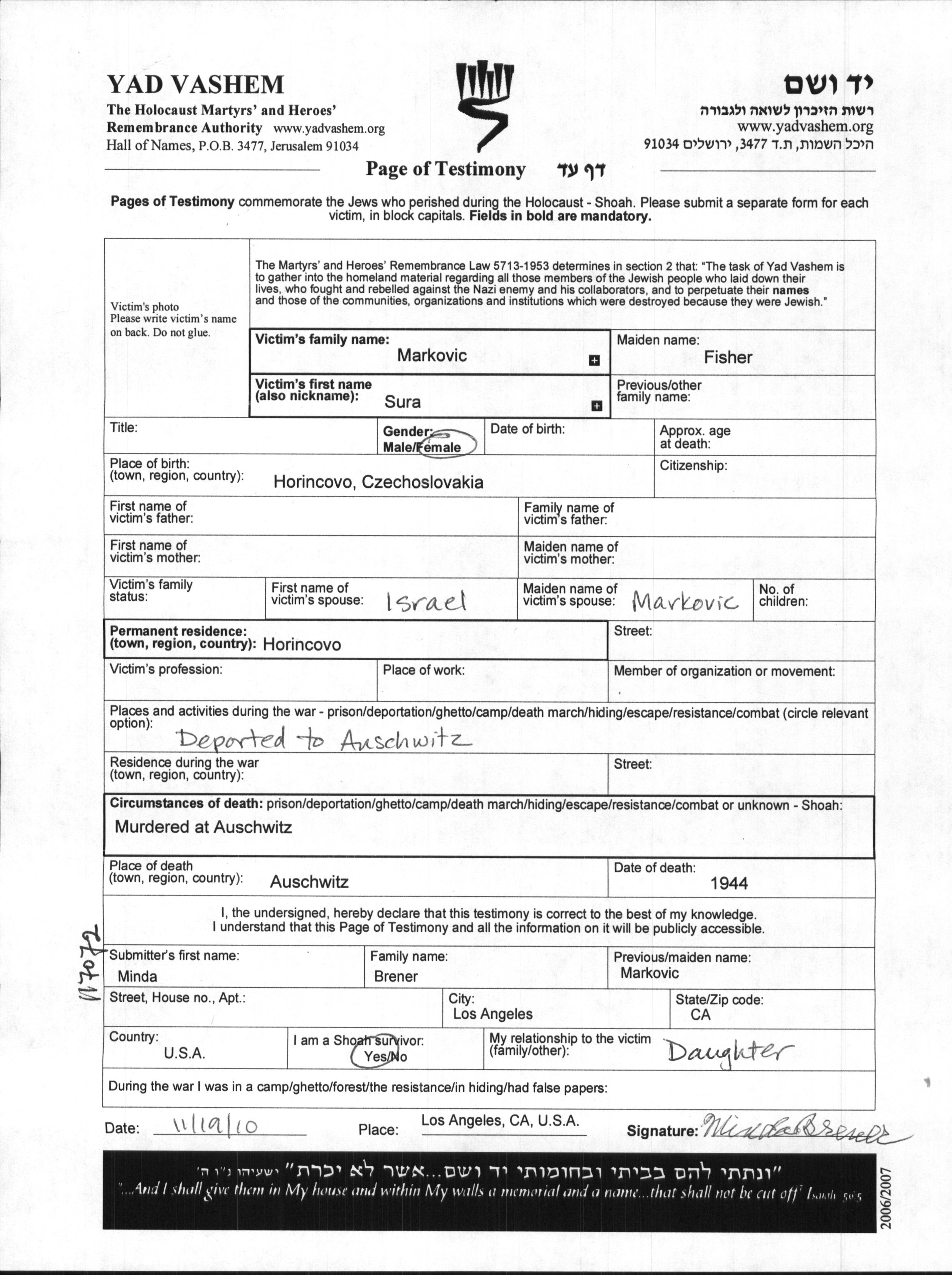 Sura Markovic, geb. Fisher wurde in Horincovo, Tschechoslowakei geboren. Sie war mit Israel Verheiratet. Vor dem Zweiten Weltkrieg lebte sie in Horincovo, Tschechoslowakei.