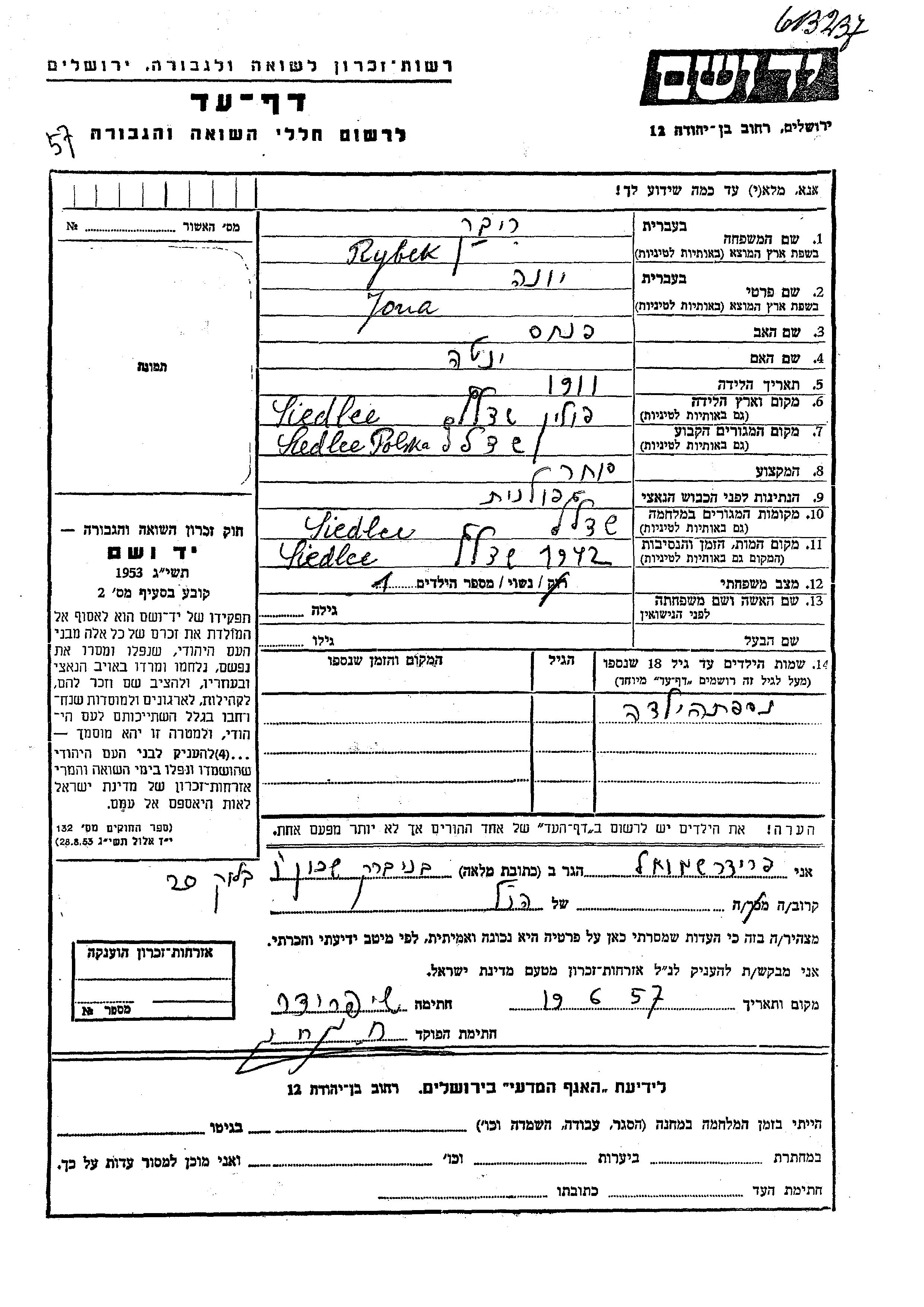 Jona Rybak wurde im Jahr 1911 in Siedlce, Polen geboren. Er war der Sohn von Pinkhas und Yenta. Er war Kaufmann/-frau und Verheiratet. Vor dem Zweiten Weltkrieg lebte er in Siedlce, Polen. Während des Krieges war er in Siedlce, Polen.