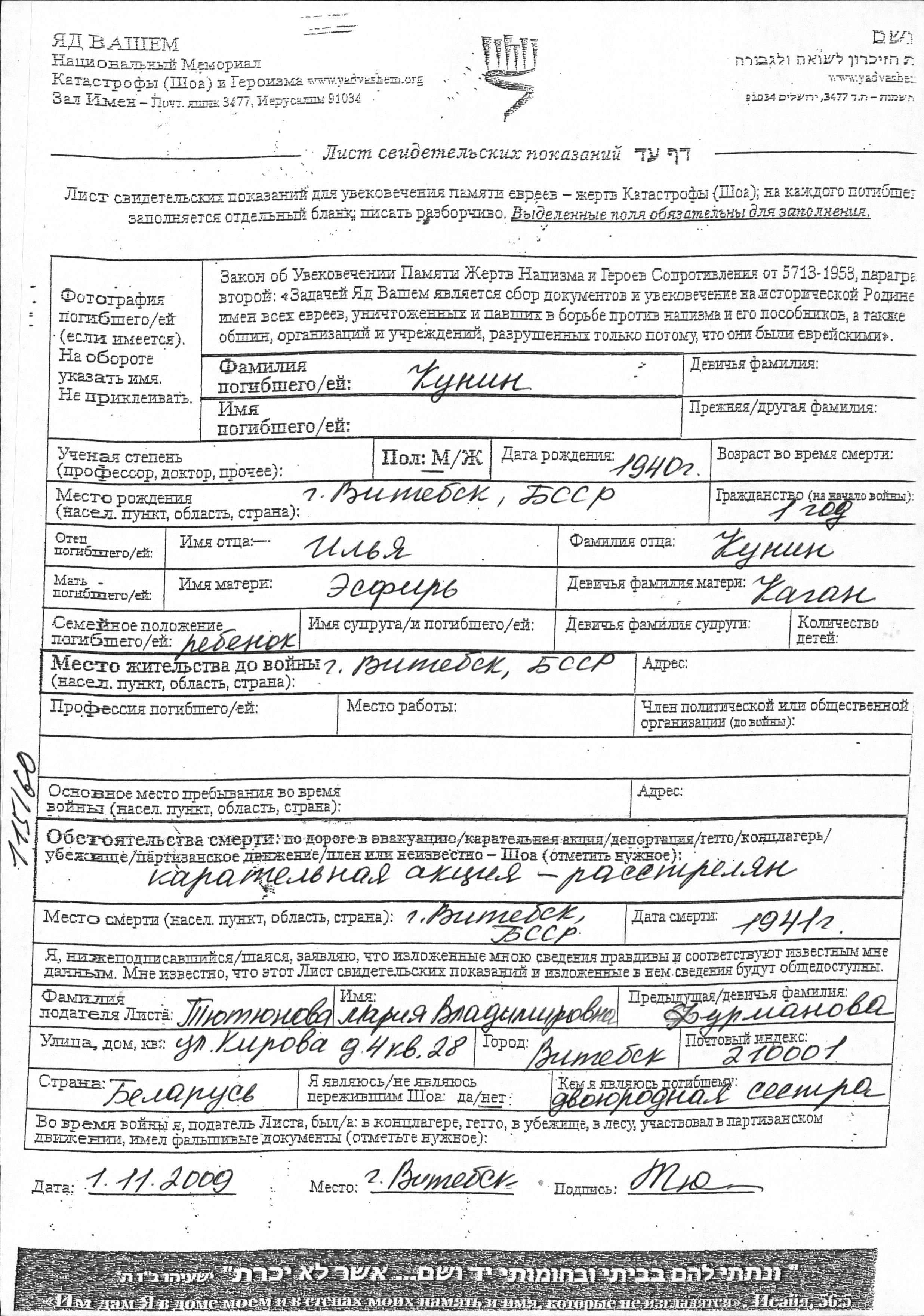 Vorname unbekannt Kunin wurde im Jahr 1940 in Vitebsk, Weißrussland (UdSSR) geboren. Er war der Sohn von Ilia und Esfir, geb. Kagan. Er war Kind. Vor dem Zweiten Weltkrieg lebte er in Vitebsk, Weißrussland (UdSSR). Während des Krieges war er in Vitebsk, Weißrussland (UdSSR).