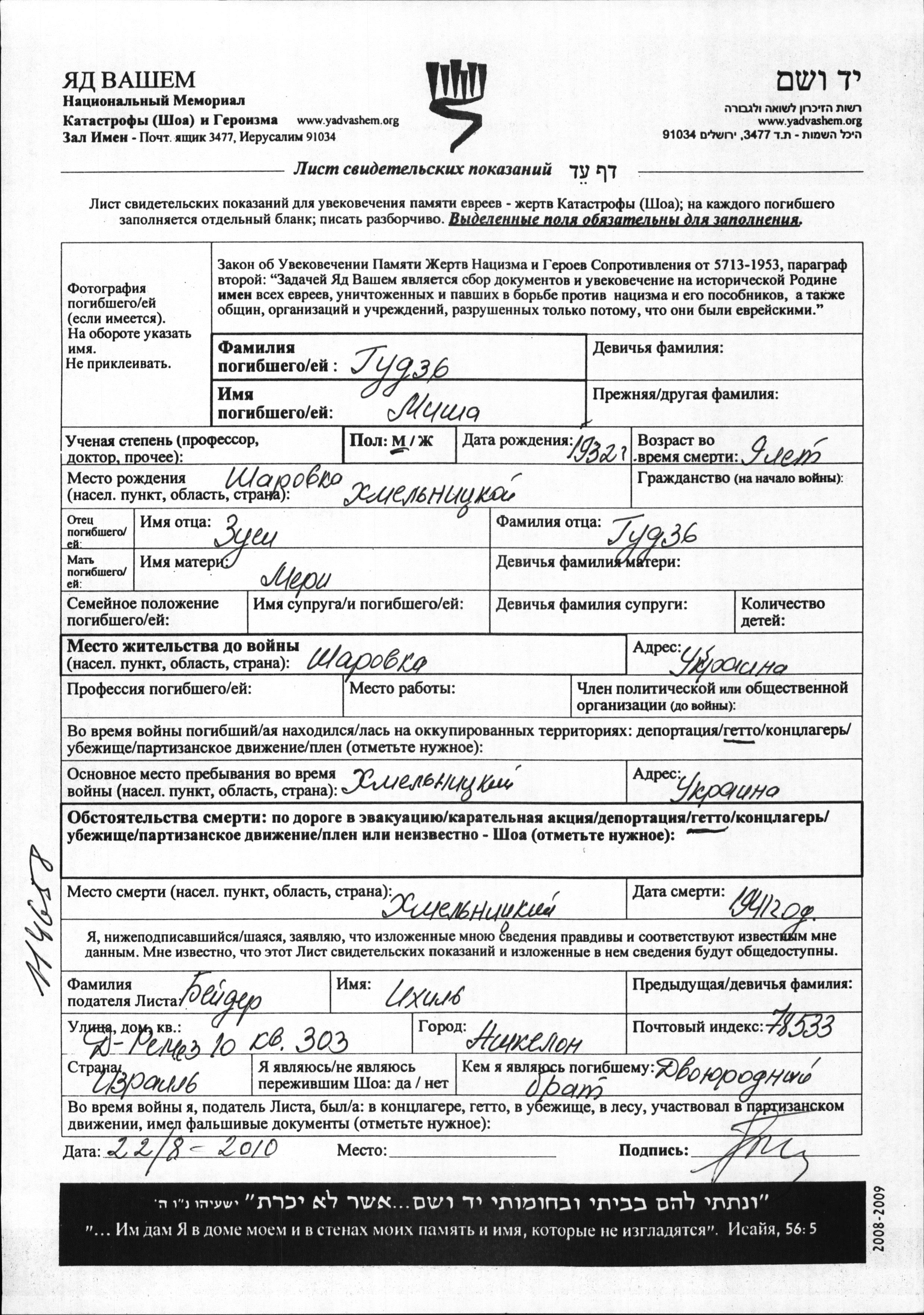 Gudz Misha 1932 Sharovka, Ukraine (UdSSR) Gedenkblatt