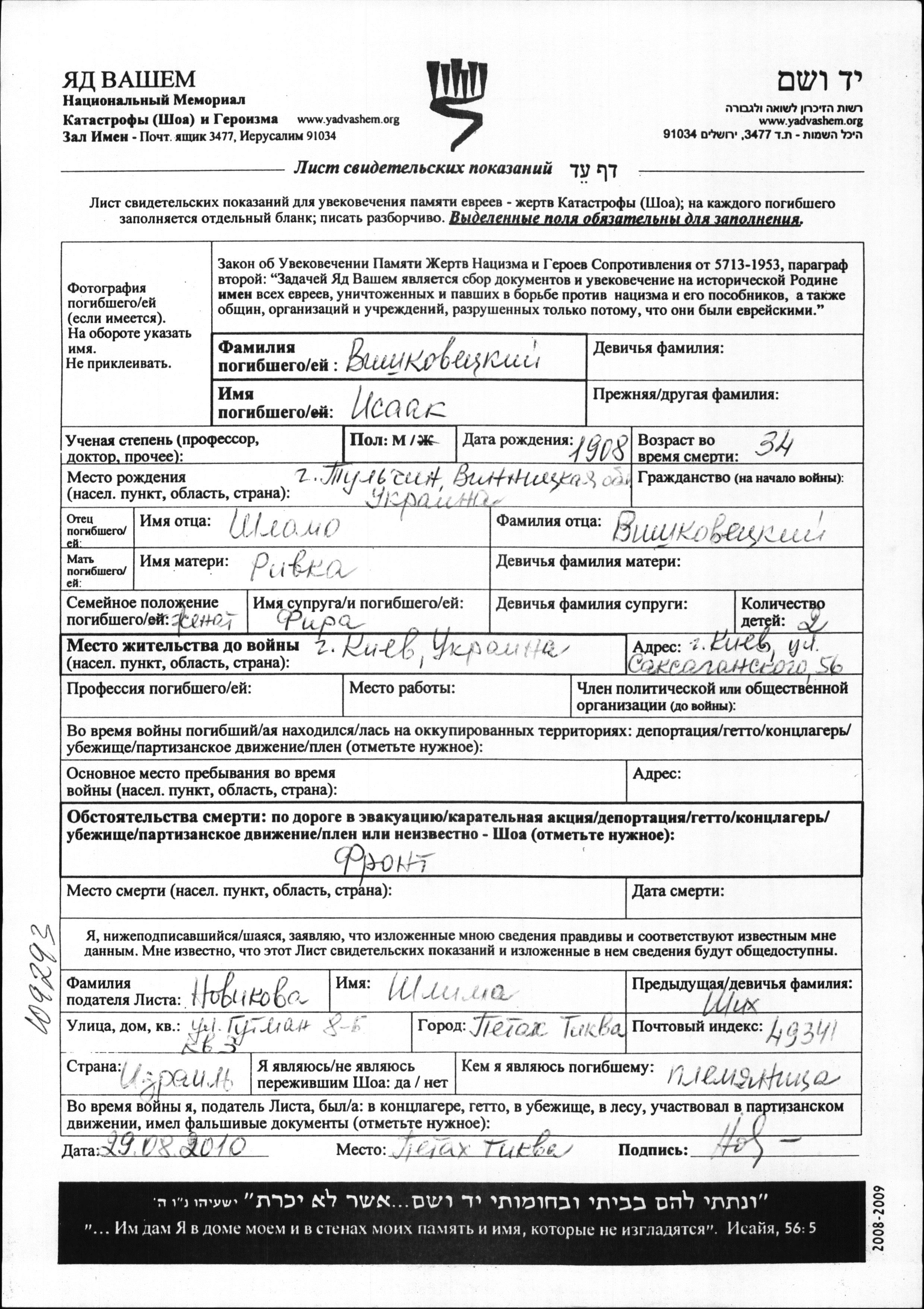 Isaak Vishkovski wurde im Jahr 1908 in Tulchin, Ukraine (UdSSR) geboren. Er war der Sohn von Shlomo und Rivka. Er war mit Fira Verheiratet. Vor dem Zweiten Weltkrieg lebte er in Kiev, Ukraine (UdSSR). Während des Krieges war er in die Sowjetischen Streitkräfte.