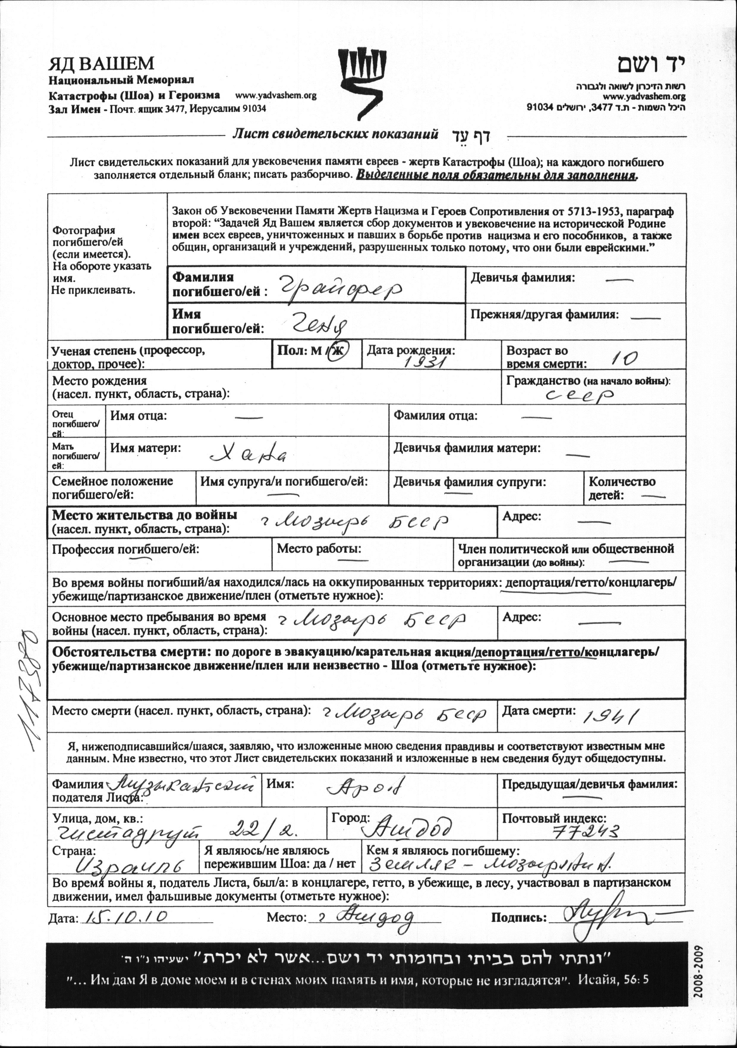Graifer Genya 1931 Mozyr, Weißrussland (UdSSR) Gedenkblatt