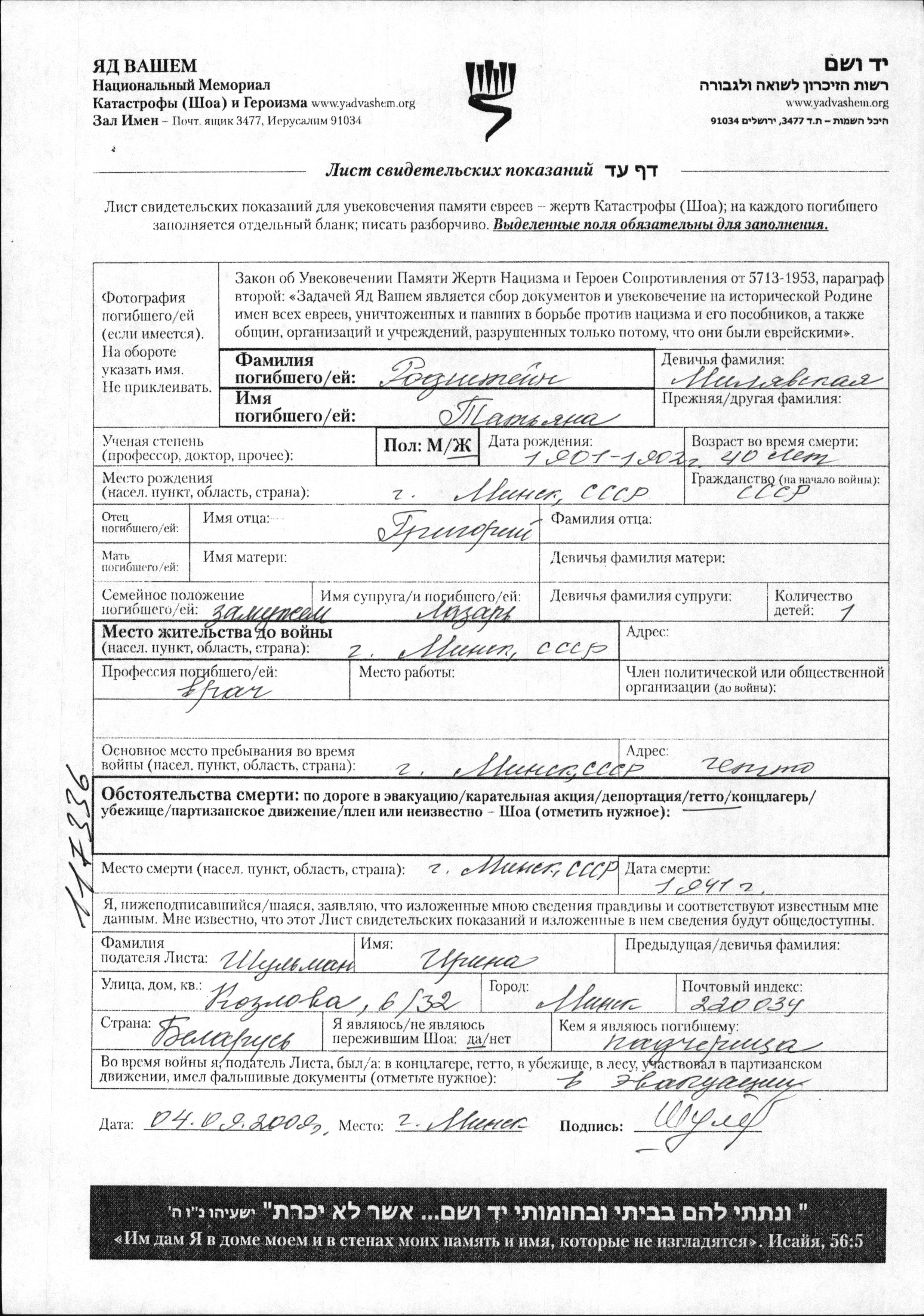 Tatyana Rodshtein, geb. Milyavskaya wurde im Jahr 1901 in Minsk, Weißrussland (UdSSR) geboren. Sie war die Tochter von Grigori. Sie war Arzt/ärztin und mit Lazar Verheiratet. Vor dem Zweiten Weltkrieg lebte sie in Minsk, Weißrussland (UdSSR). Während des Krieges war sie in Minsk, Weißrussland (UdSSR).