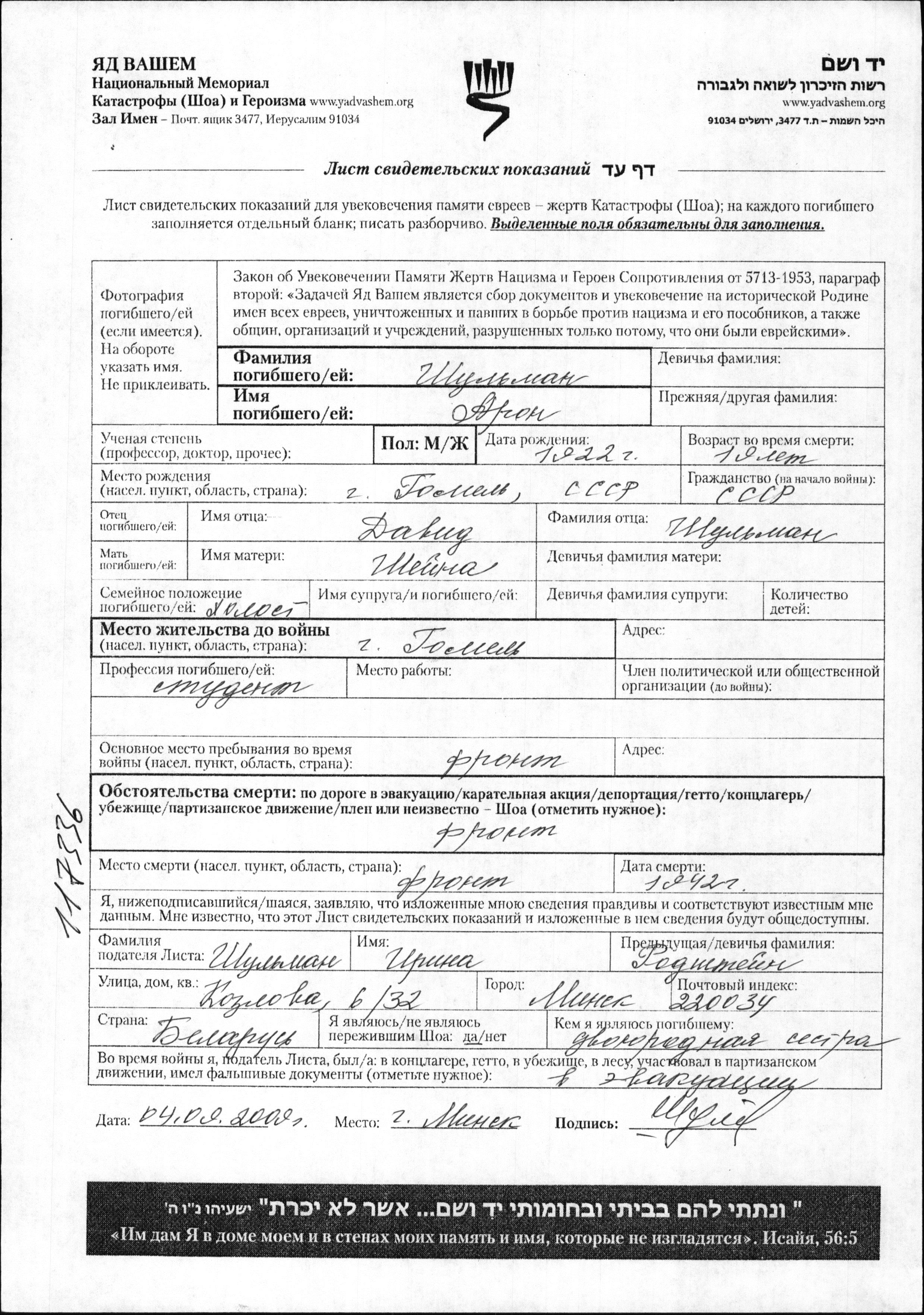 Shulman Aron 1922 Gomel, Weißrussland (UdSSR) Gedenkblatt