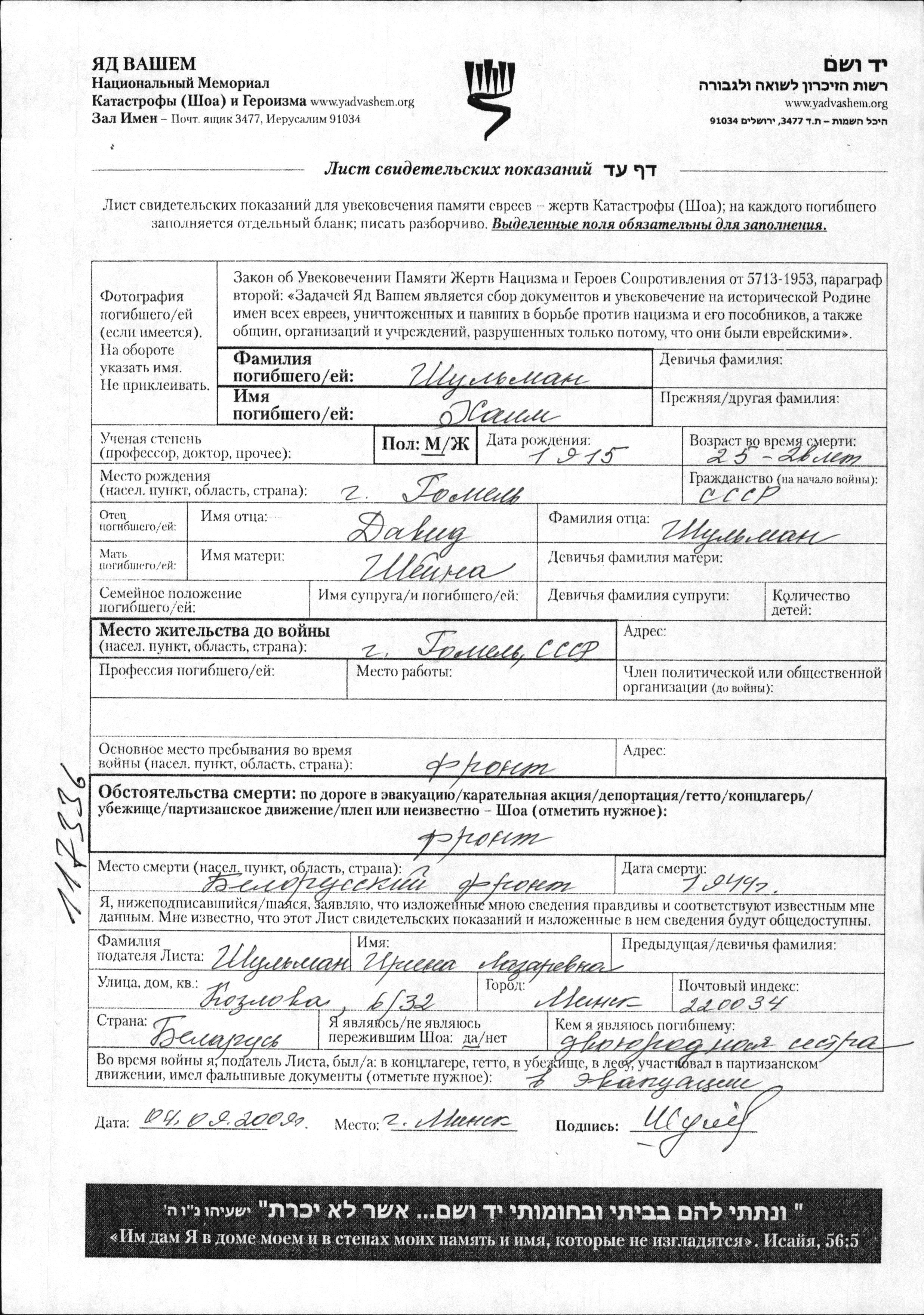 Khaim Shulman wurde im Jahr 1915 in Gomel, Weißrussland (UdSSR) geboren. Er war der Sohn von David und Sheyna. Vor dem Zweiten Weltkrieg lebte er in Gomel, Weißrussland (UdSSR). Während des Krieges war er in die Sowjetischen Streitkräfte. Khaim im Militärdienst umgekommen. Todesort: Weißrussland (UdSSR) im Jahr 1944.