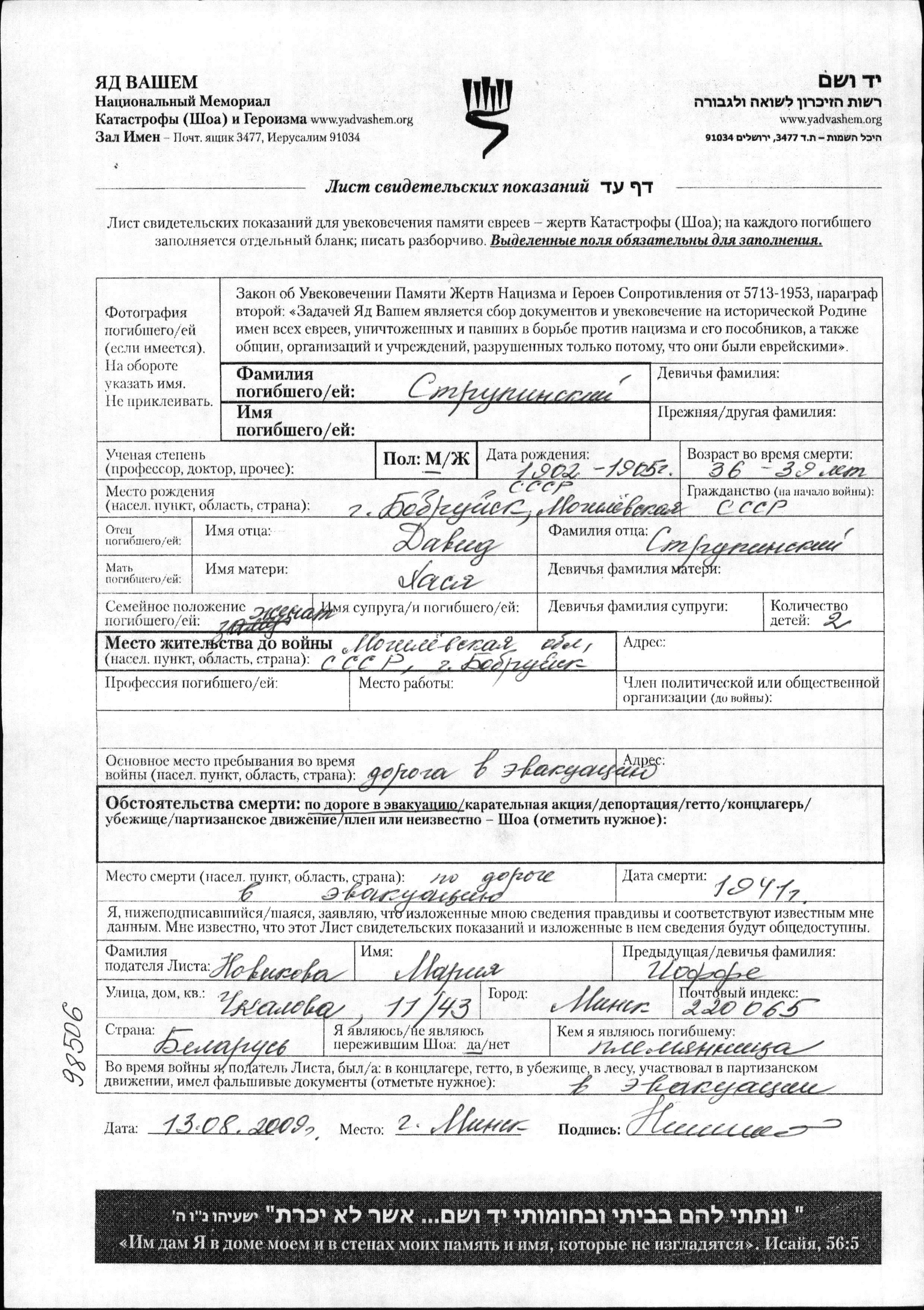 Vorname unbekannt Strupinski wurde im Jahr 1902 in Bobruysk, Weißrussland (UdSSR) geboren. Er war der Sohn von David und Khasya. Er war Verheiratet. Vor dem Zweiten Weltkrieg lebte er in Bobruysk, Weißrussland (UdSSR).