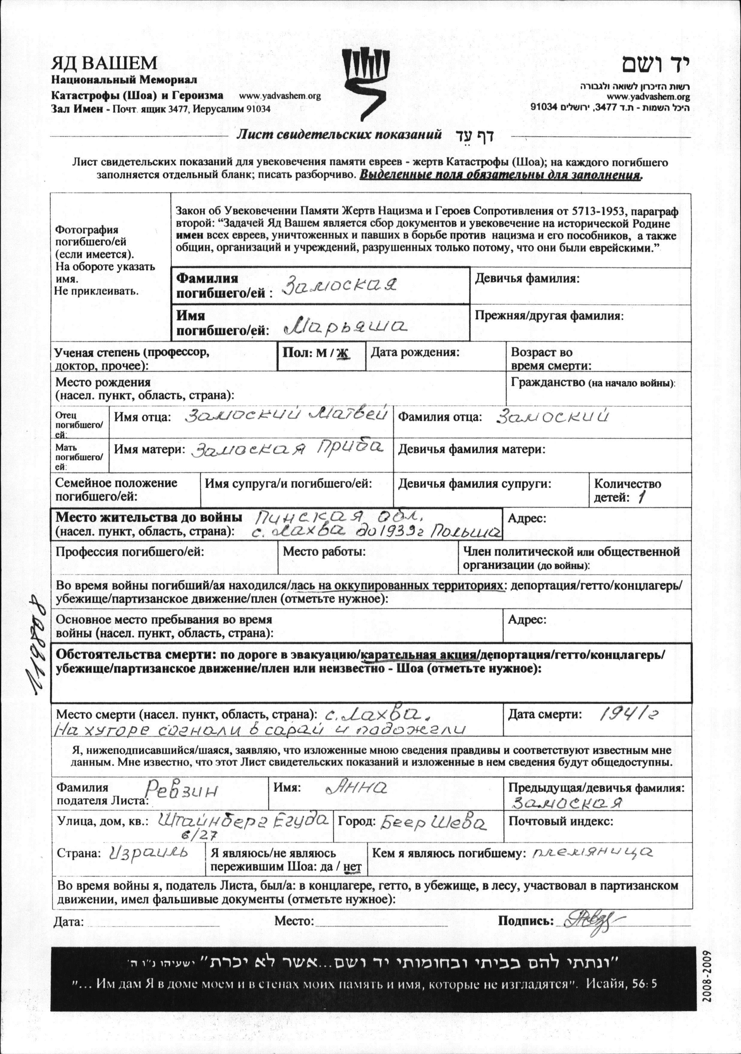 Mariyana Zamoskaya wurde Sie war die Tochter von Matvey und Priba. Vor dem Zweiten Weltkrieg lebte sie in Lachwa, Polen. Während des Krieges war sie in Lachwa, Polen.