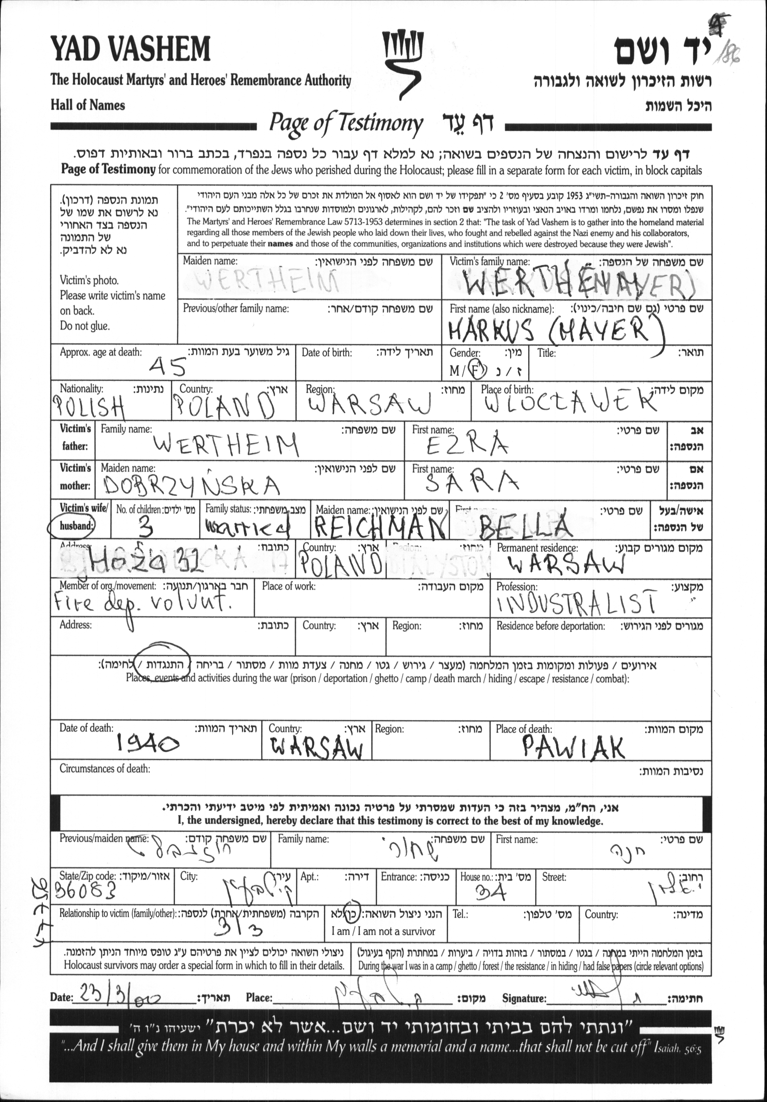 Markus Mayer Wertheimer wurde in Wloclawek, Polen geboren. Er war der Sohn von Ezra und Sara, geb. Dobrzynska. Er war Industrielle/-r und mit Bella, geb. Reichman Verheiratet. Vor dem Zweiten Weltkrieg lebte er in Warszawa, Polen. Während des Krieges war er in Warszawa, Polen.