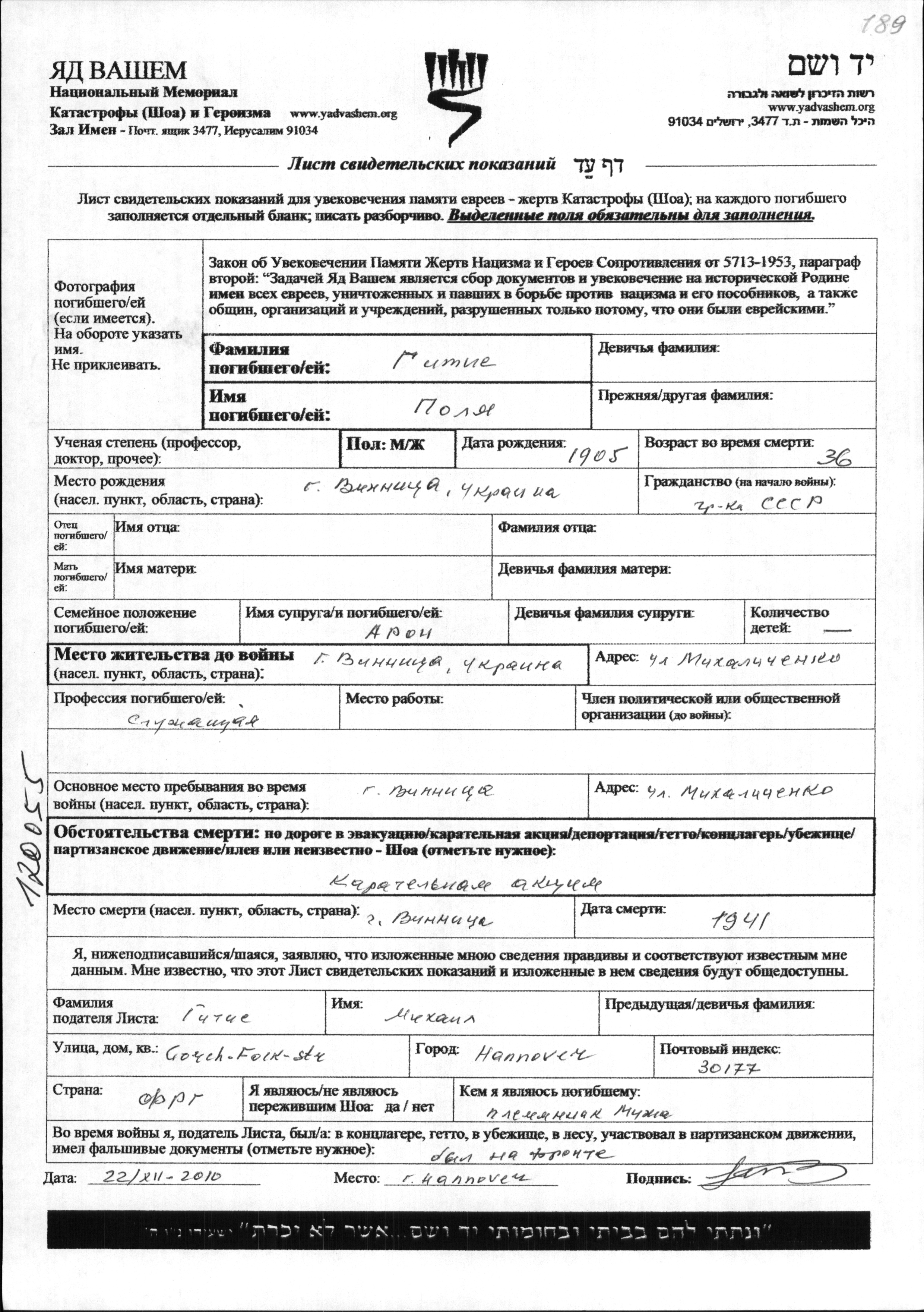 Polya wurde in der Schoah ermordet. Todesort: Vinnitsa, Ukraine (UdSSR) im Jahr 1941.