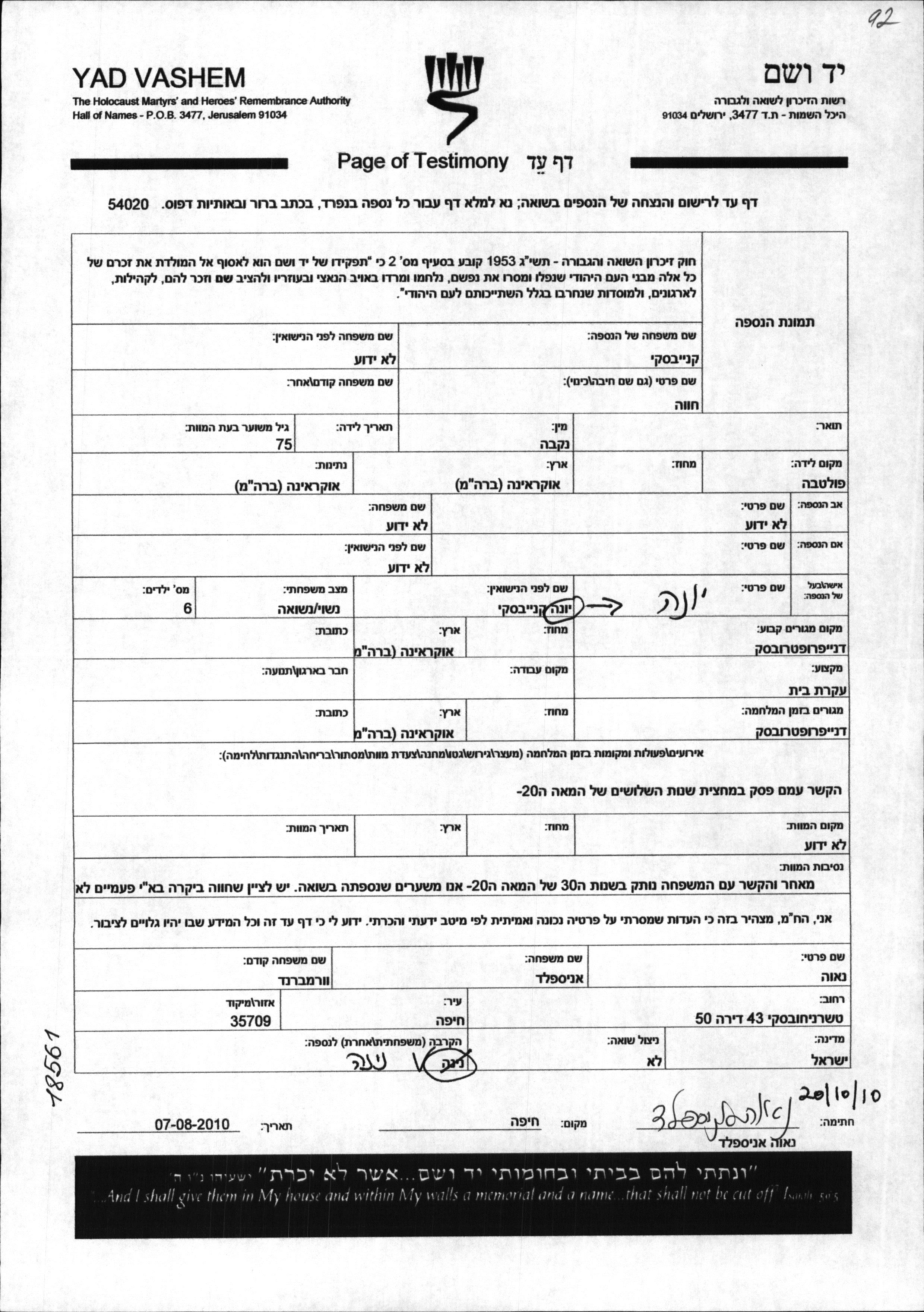 Khava Kanevski wurde in Poltava, Ukraine (UdSSR) geboren. Sie war Hausfrau und mit Yona Verheiratet. Vor dem Zweiten Weltkrieg lebte sie in Dnepropetrovsk, Ukraine (UdSSR). Während des Krieges war sie in Dnepropetrovsk, Ukraine (UdSSR).