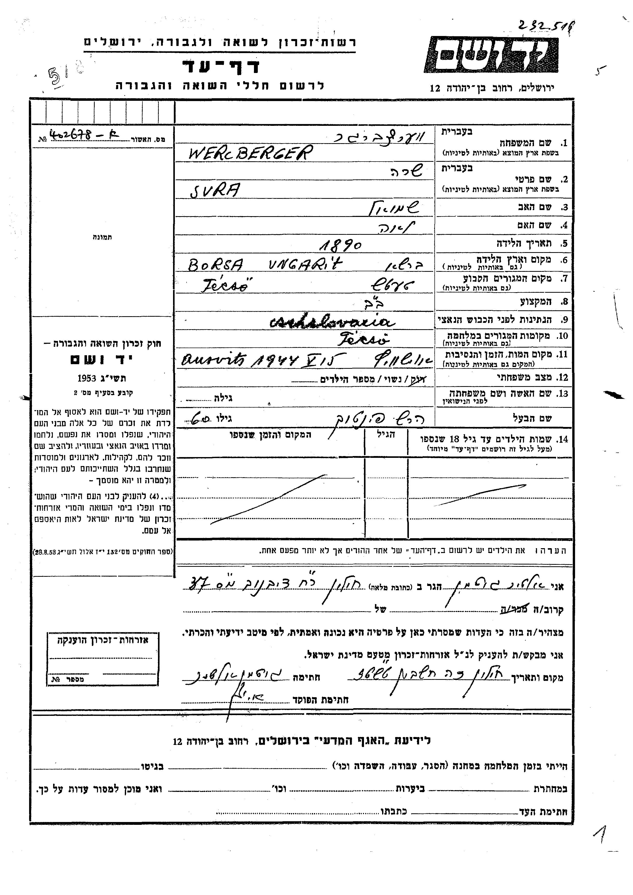 Sura Wercberger Pintok, geb. Wercberger wurde im Jahr 1890 in Borsha, Rumänien geboren. Sie war die Tochter von Shmuel und Lea. Sie war Hausfrau und mit Hersh Verheiratet. Vor dem Zweiten Weltkrieg lebte sie in Tecso. Während des Krieges war sie in Tecso.