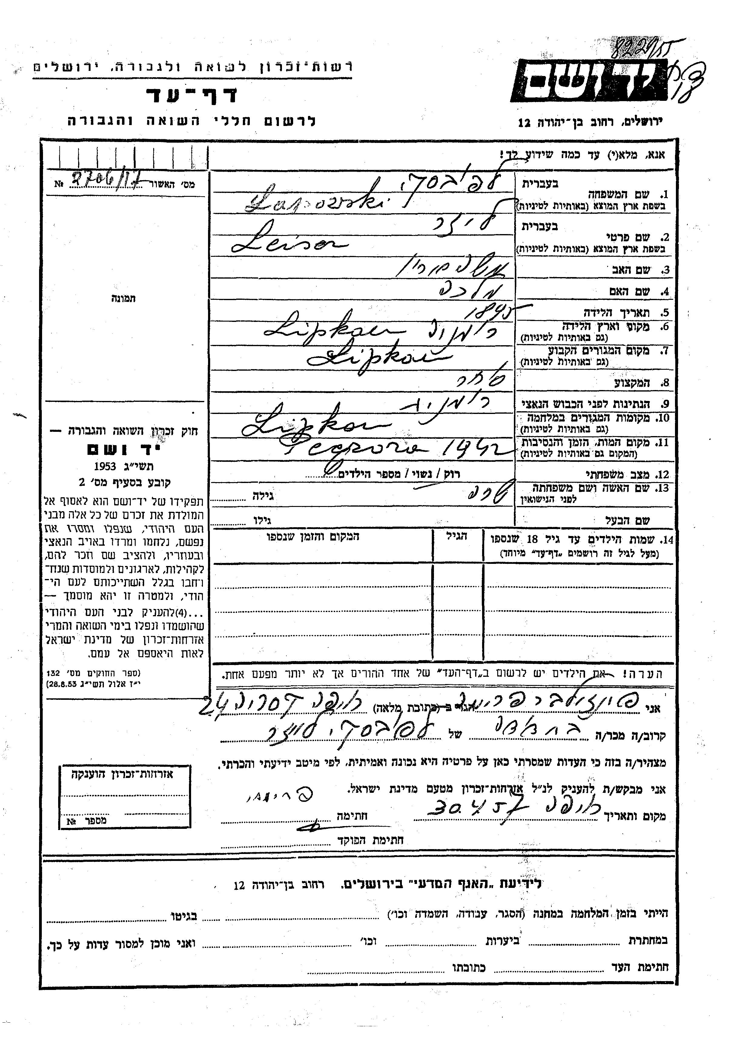 Leiser Lapowski wurde im Jahr 1895 in Lipkani, Rumänien geboren. Er war der Sohn von Moshe Aron und Malka. Er war Kaufmann/-frau und mit Sara Verheiratet. Vor dem Zweiten Weltkrieg lebte er in Lipkani, Rumänien. Während des Krieges war er in Lipkani, Rumänien.