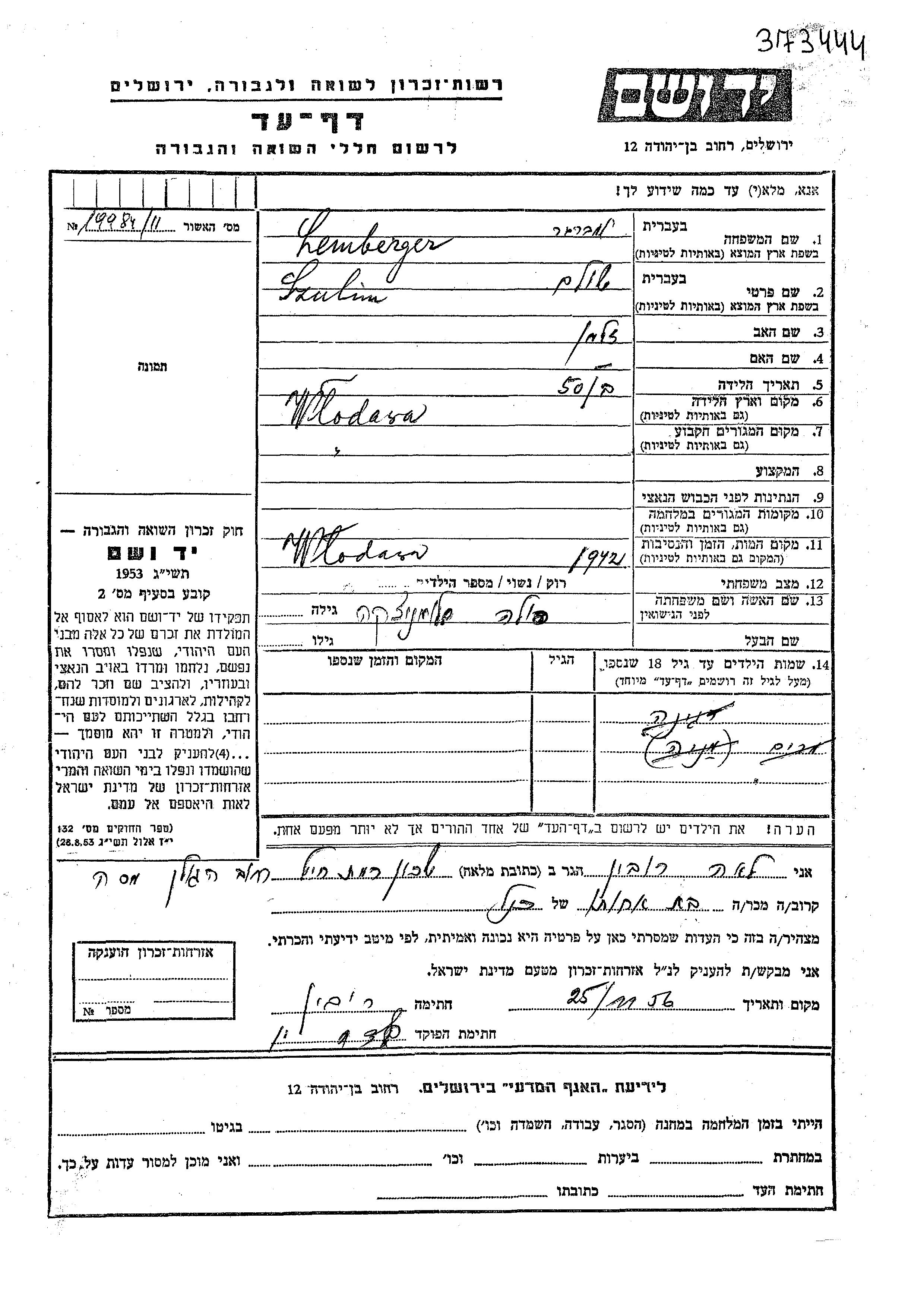 Szulim Lemberger wurde in Wlodowa, Polen geboren. Er war der Sohn von Zalman. Er war mit Pola, geb. Slomnitzki Verheiratet.