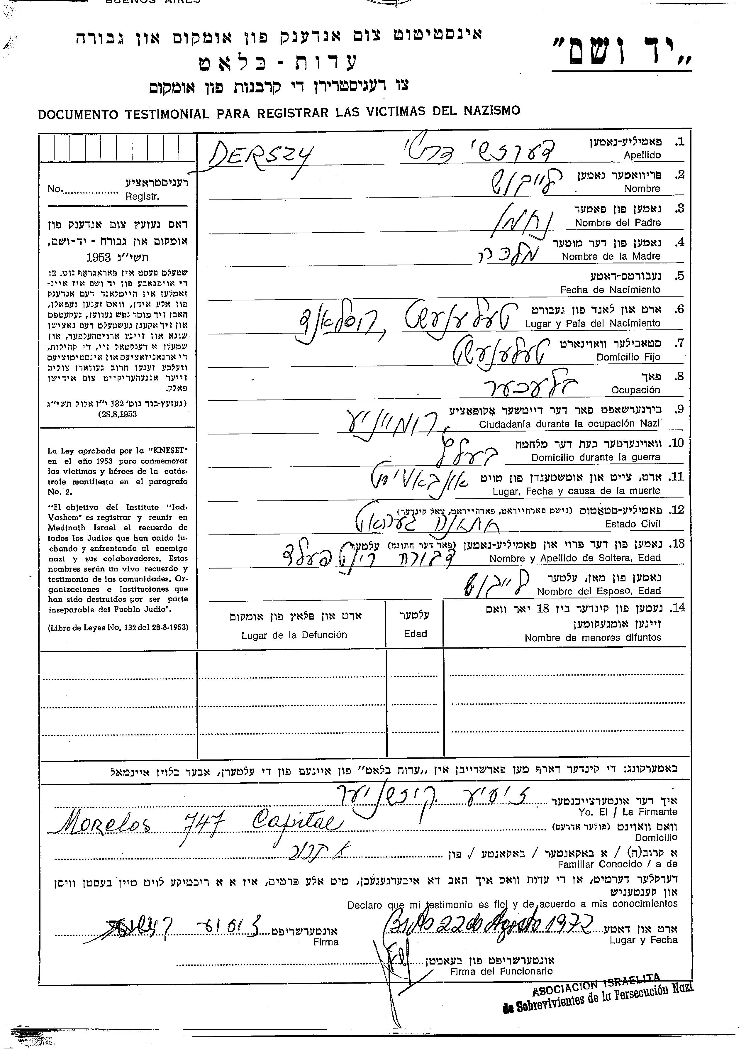 Leibush Derszy wurde in Telenesht, Rumänien geboren. Er war der Sohn von Nakhman und Malka. Er war Blechschmied und mit Dvora, geb. Rintfeld Verheiratet. Vor dem Zweiten Weltkrieg lebte er in Telenesht, Rumänien. Während des Krieges war er in Balti, Rumänien.